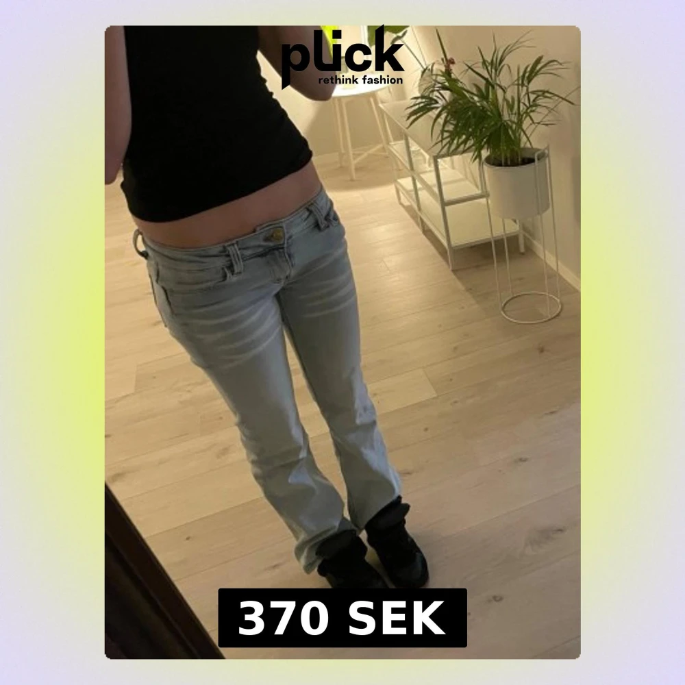 Säljer ett par ljusblå jeans från Cheap Monday med bootcut-snitt och låg midja. Jeansen har ett coolt svartvitt tryck på bakfickan och klassiska fem fickor. Materialet är jeans och passformen är normal med lite utsvängda ben.