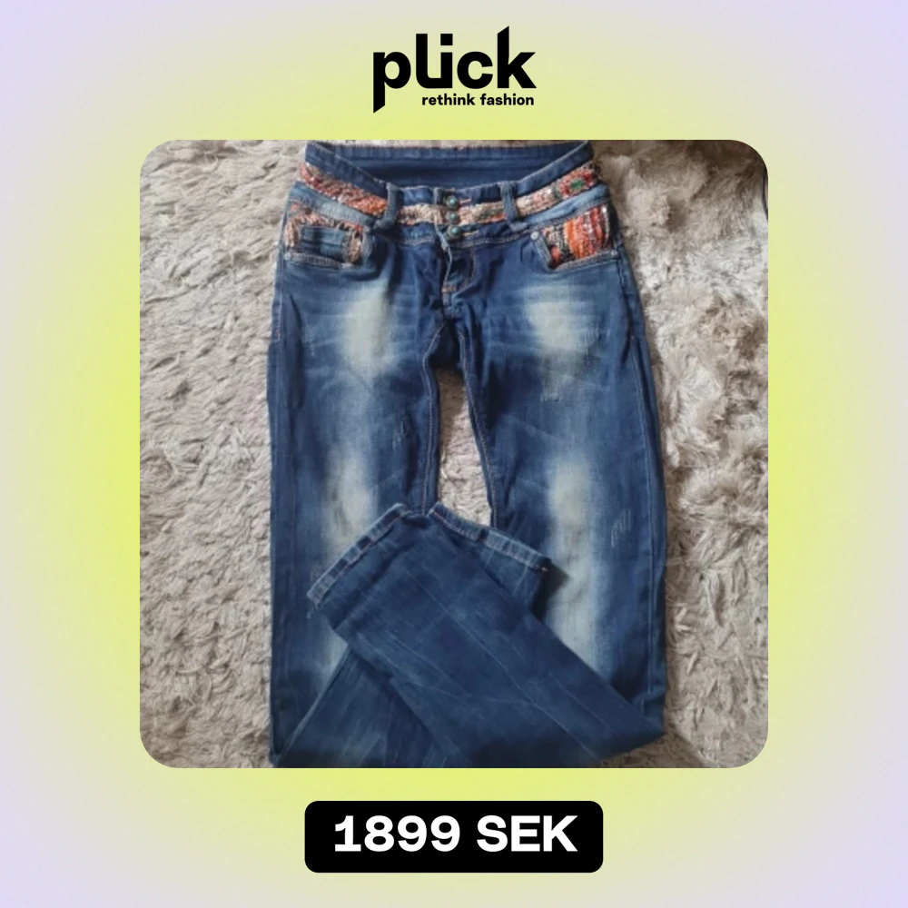 Jeans som är ovanliga med massa detaljer..massa paljetter både fram och bak snygga knappar låg midjande ..fickor fram bak snygga slitningar storlek 26 passar xs s väldigt fint skick!