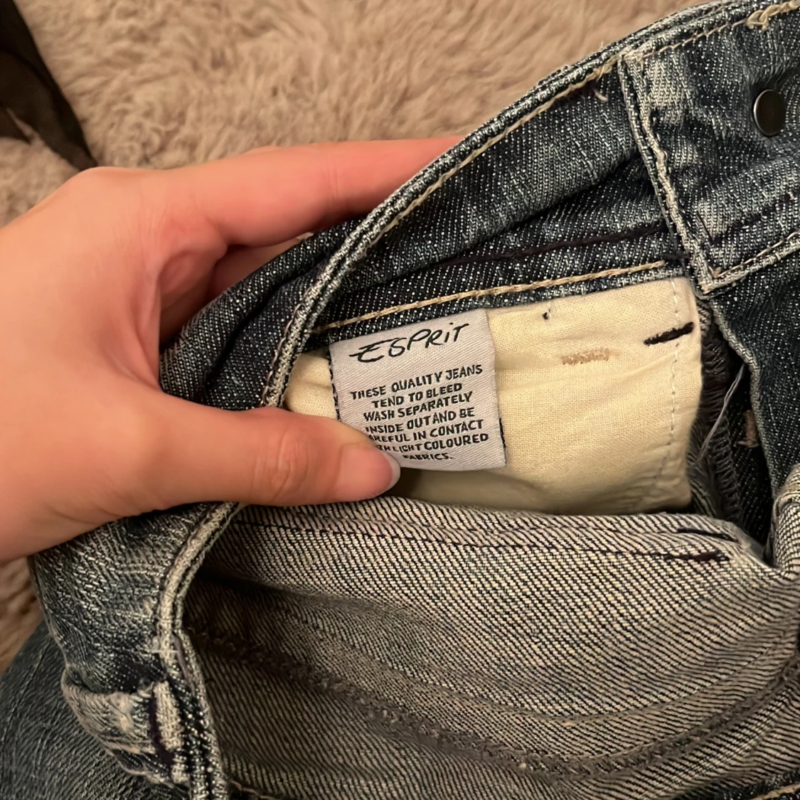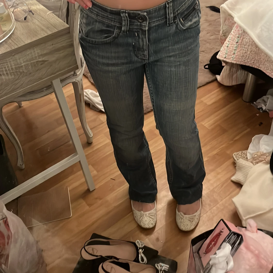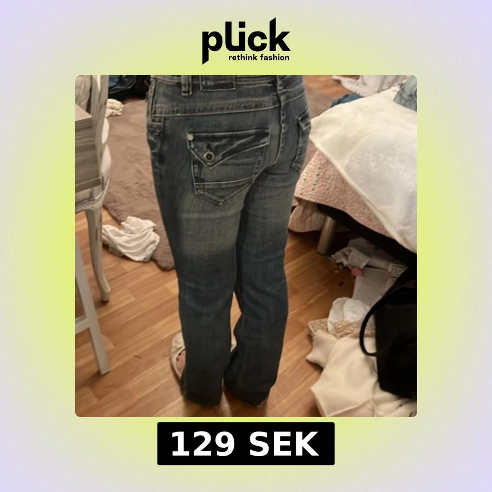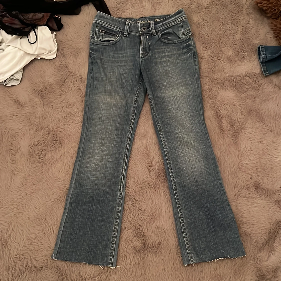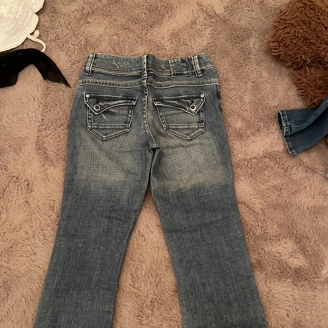 Säljer ett par blå jeans med bootcut passform och snygga detaljerade bakfickor med lock och knapp. Jeansen har låg midja och slitna kanter vid benslut för en avslappnad vibe. Materialet är klassisk denim och färgen är tvättad blå med ljusare partier.