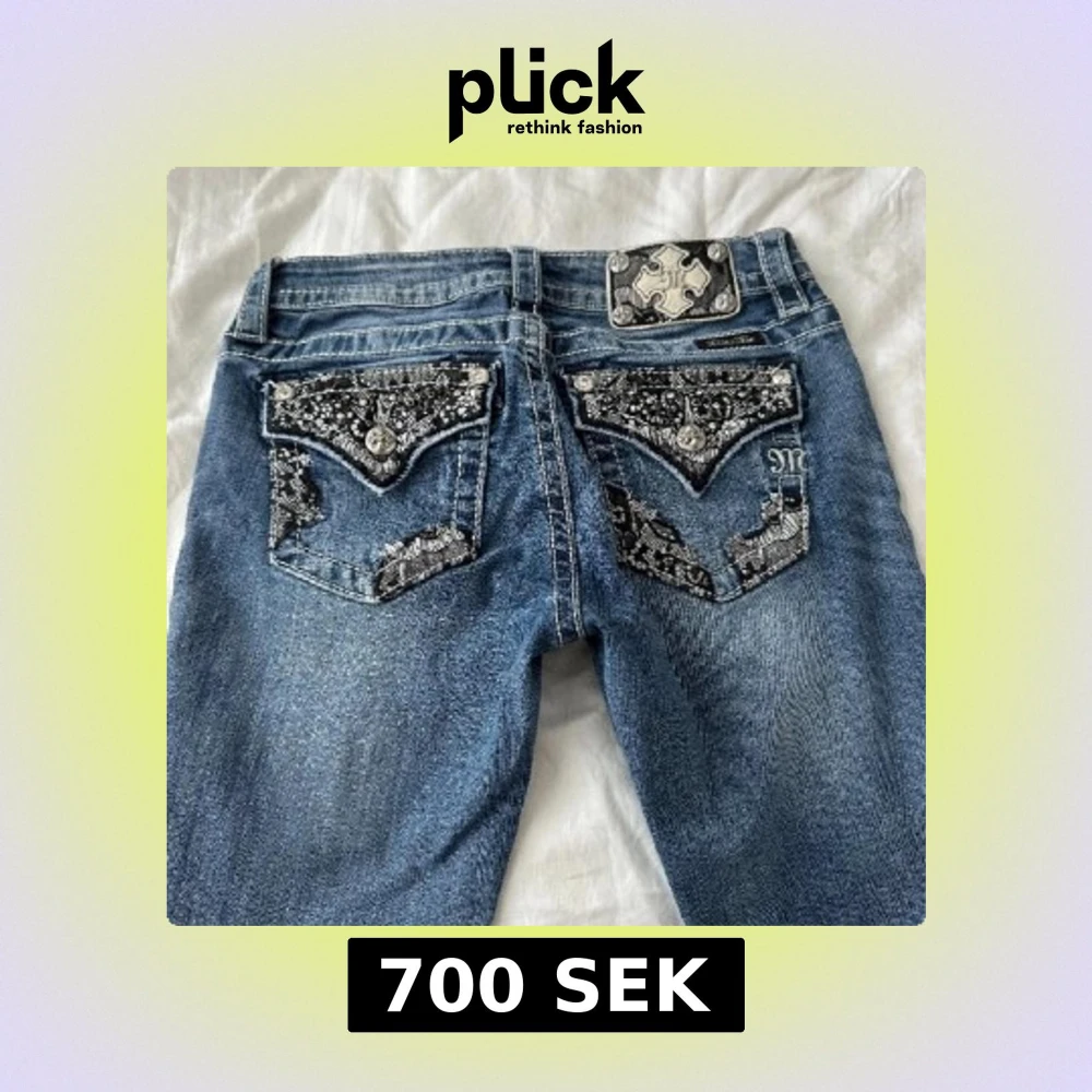 Snygga blå jeans med unika broderade detaljer på bakfickorna. De har en bootcut-stil, har tappt några pärlor på fickorna vilket syns på första bilden. Kan skicka närmare om man vill, dom har en liten fläck på benet (sista bilden) men inget som man tänker på. Finns även slitage på sidan av fickorna, kan skicka bild på det om man vill. Skriv om ni har flera frågor!💕 Midja rakt över:40cm innerbenslängd:81 LÅNADE BILDER FRÅN HON JAG KÖPTE DOM AV!
