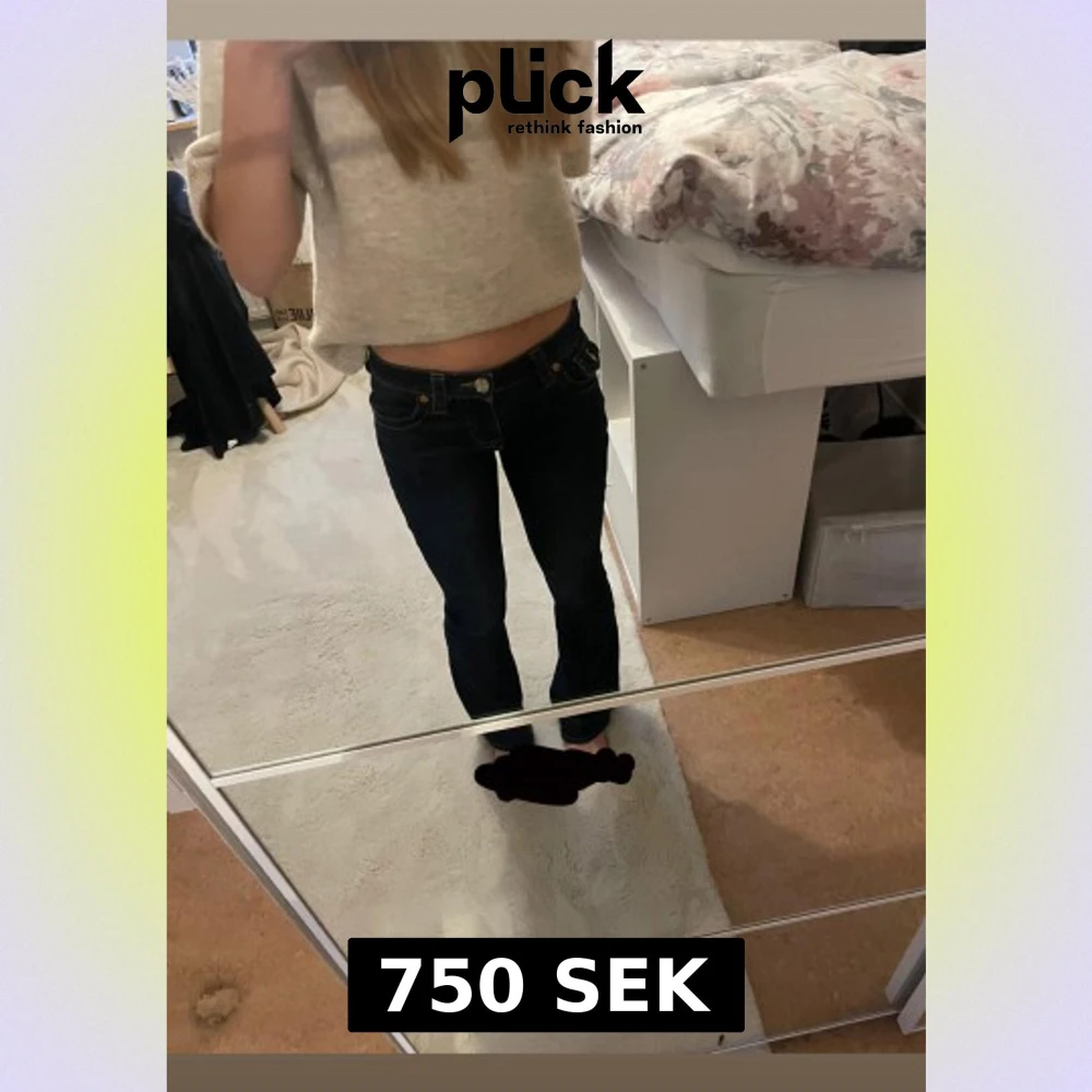 W27. Säljer ett par mörkblå jeans från True Religion med klassiska kontrastsömmar och snygga detaljer på bakfickorna. Modellen är lågmidjad och har bootcut-ben, vilket ger en schysst siluett. Jeansen är i jeansmaterial och har en ikonisk patch bak.