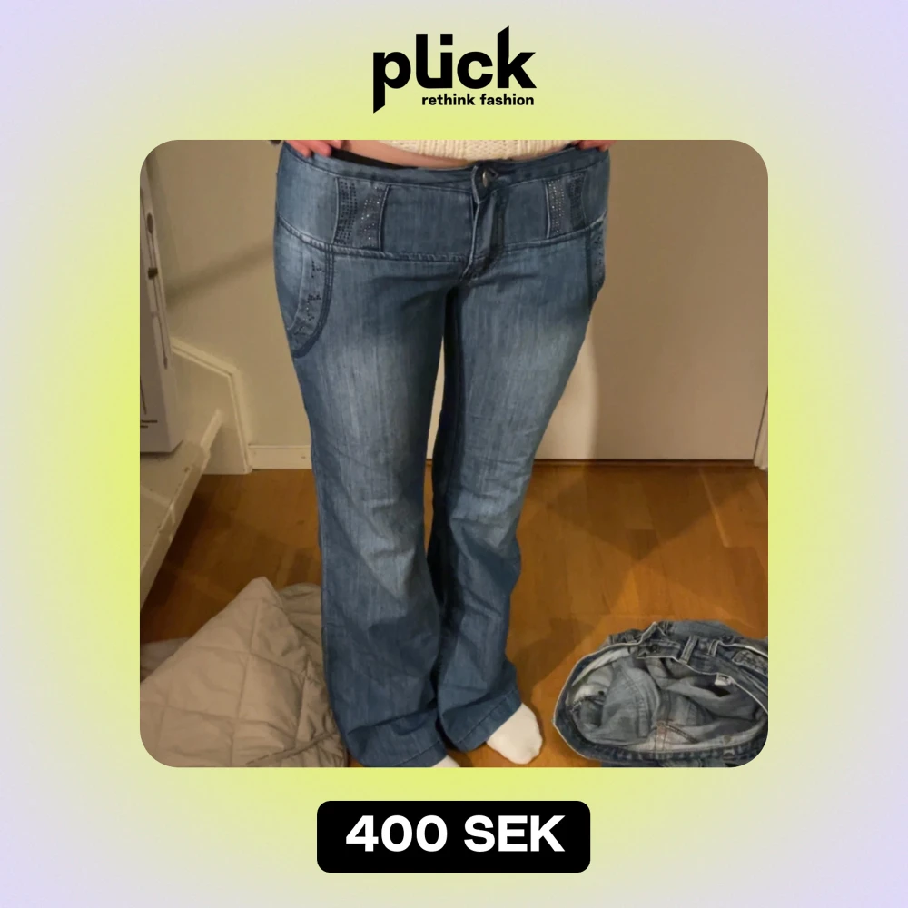 Säljer ett par snygga blå jeansbyxor med bootcut. De har en låg midja och dekorativa sömmar vid fickorna. Perfekta för en avslappnad stil och passar till både vardag och fest. Sköna och trendiga!