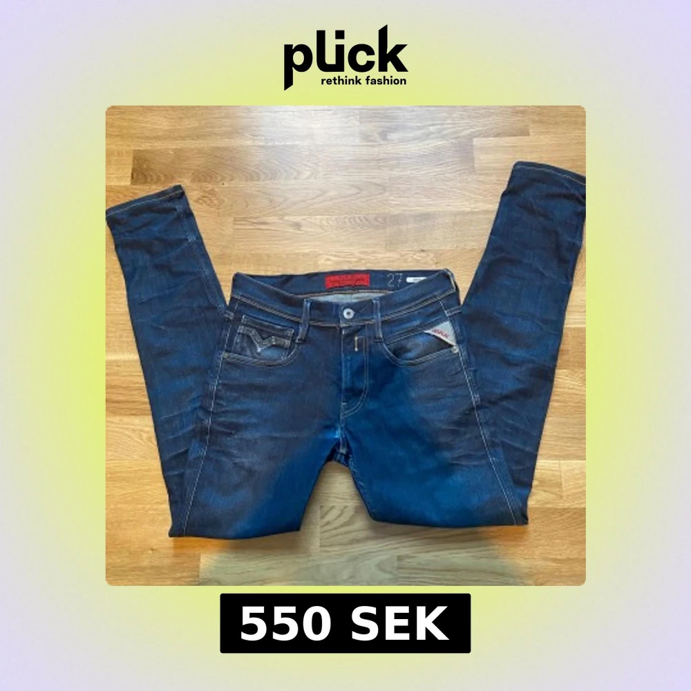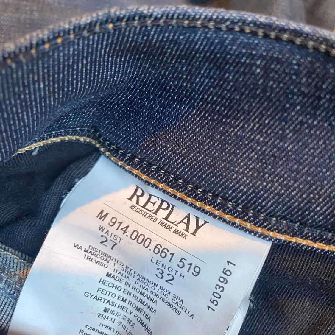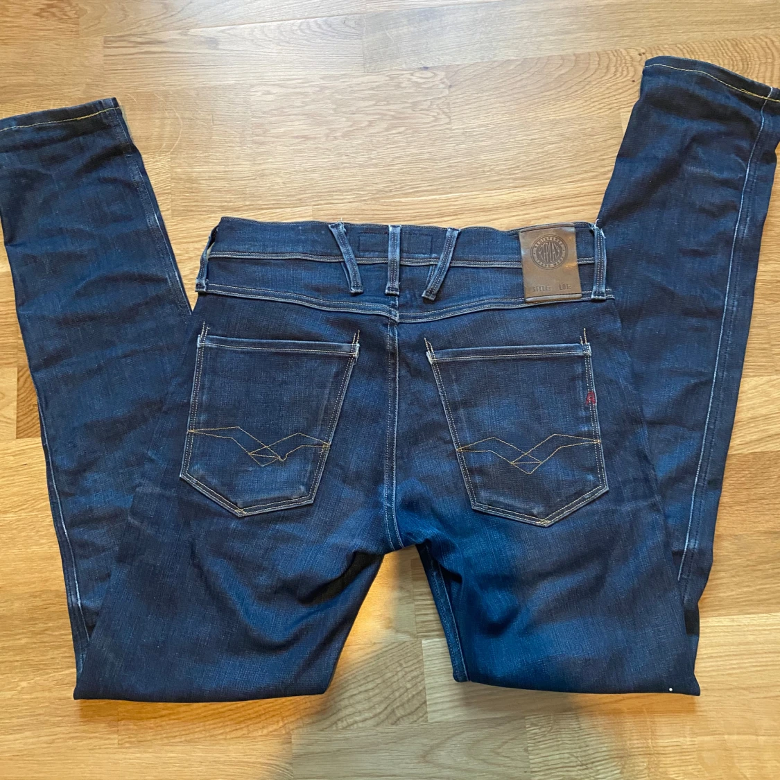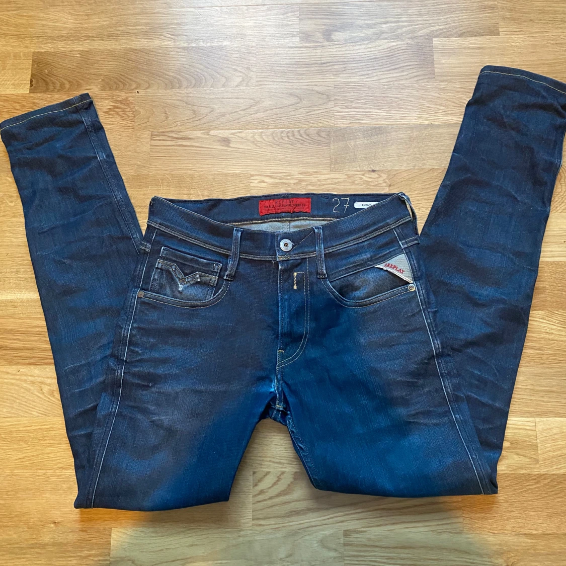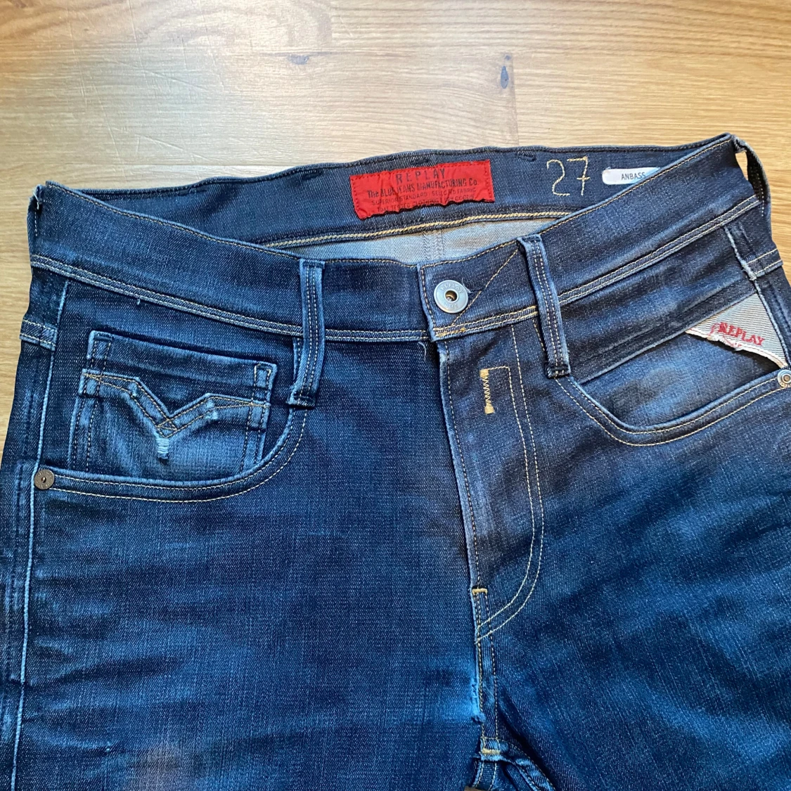 Snygga mörkblå jeans från Replay med klassisk femficksdesign och knappgylf. Jeansen är slim fit och är tillverkade i slitstarkt denim. Storleken är w27 och L32. Lite sönder där du ser på bilden men syns inte när man har på dem. Om du har några frågor tveka inte priset kan diskuteras. Nypris=1799 mitt pris=249