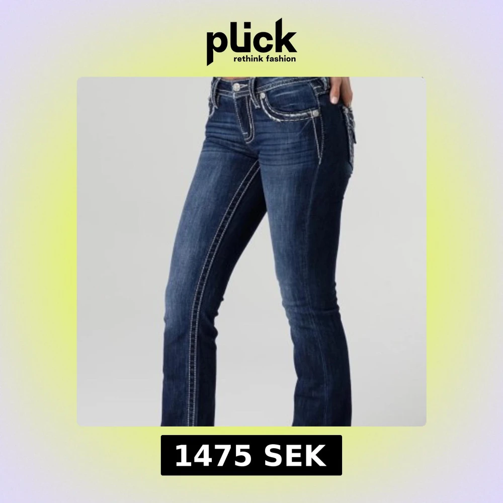 Snygga blå miss me bootcut jeans med markerade vita sömmar och detaljerade broderier på bakfickorna. Jeansen har låg midja och klassisk femficksdesign. Materialet är jeans med stretch för extra komfort.