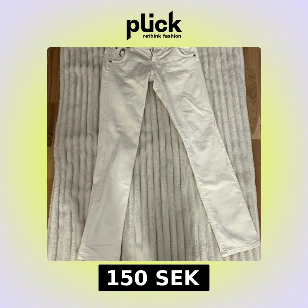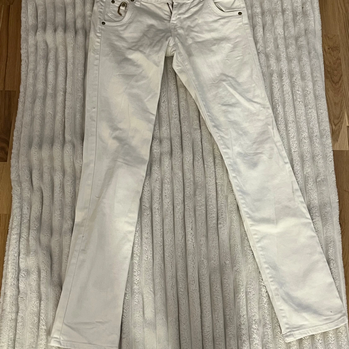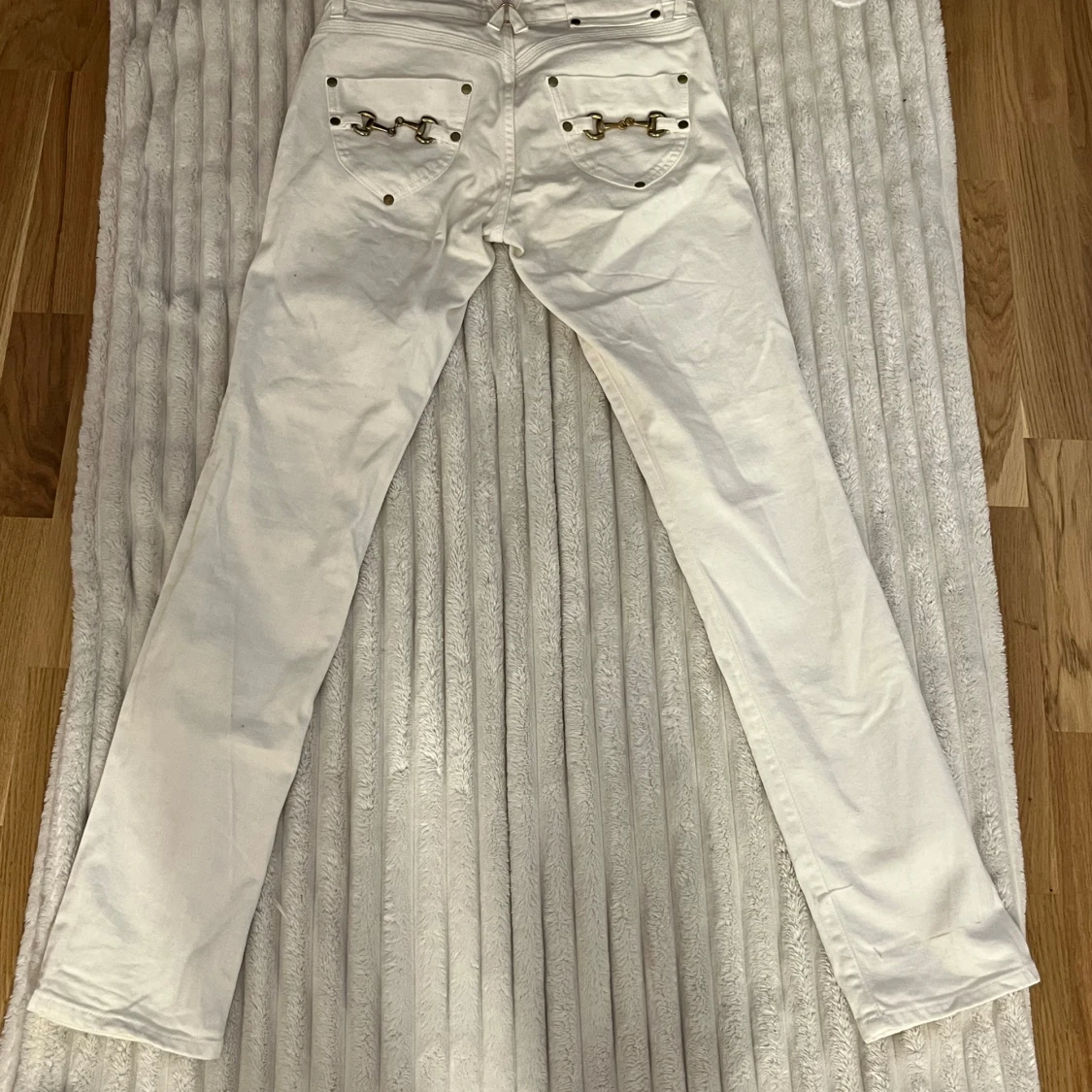 Snygga vita jeansbyxor från Gina Jeans med raka ben och coola guldfärgade detaljer på bakfickorna. Klassisk femficksmodell med metallnitar och dragkedja. Perfekt för dig som gillar stilrena och trendiga jeans.
