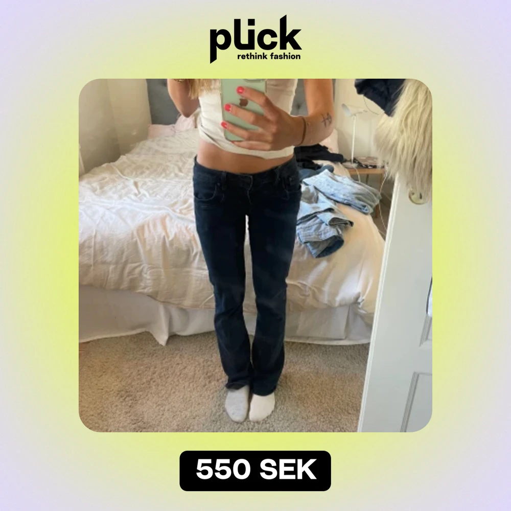 Ltb jeans low waist och valerie! Storlek 27/32 och jag på bilden är 165cm🩷 de är en mörk mörk blå färg