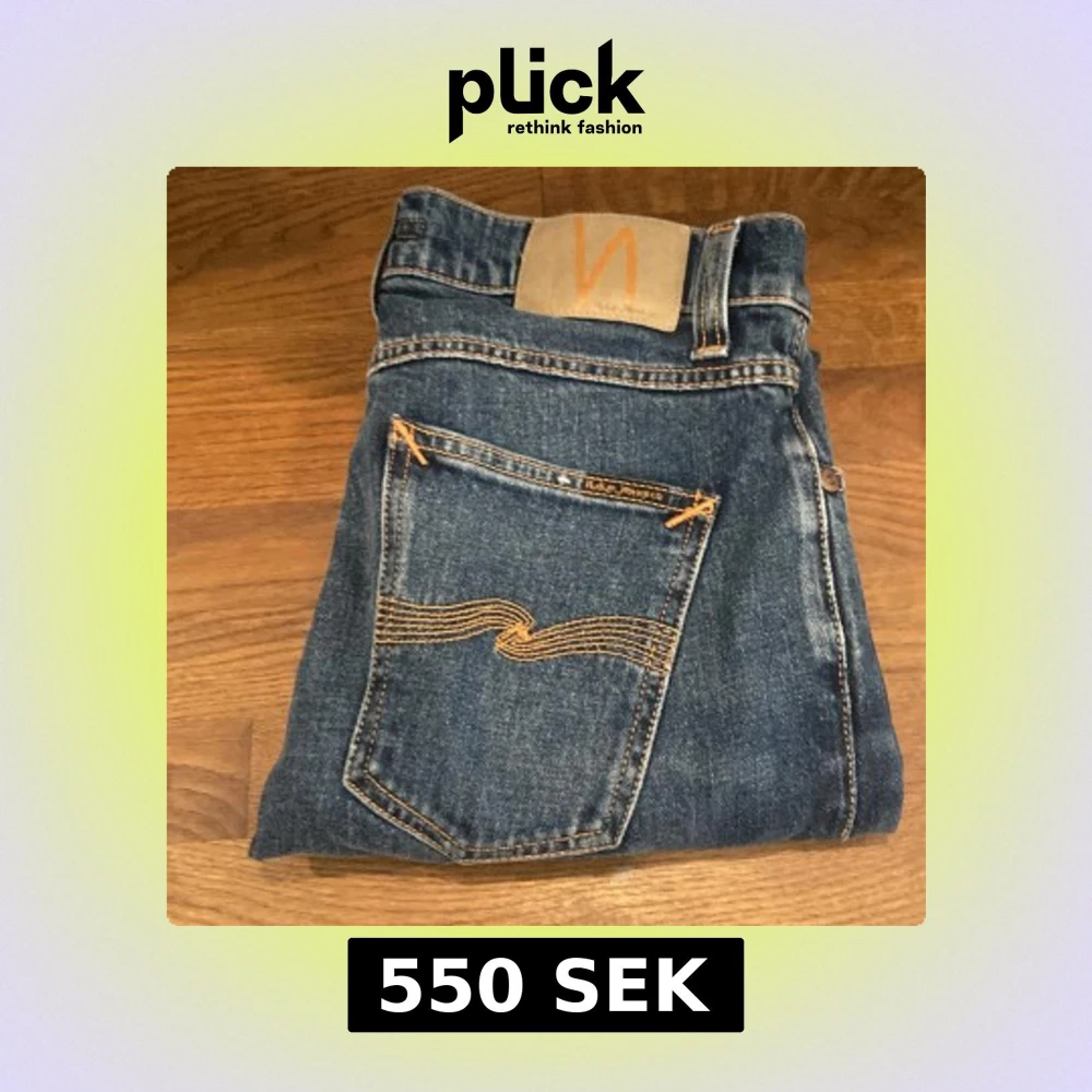 Snygga blå jeans från Nudie Jeans med klassisk femficksdesign och orange sömmar. Perfekta för en avslappnad stil. Midwaist och normal passform. Aldrig använd