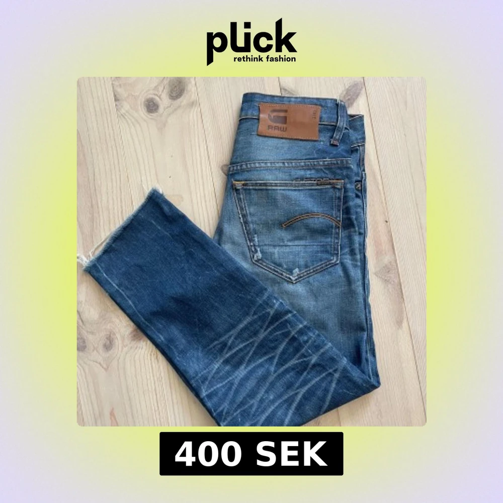 Snygga blå jeans från G-Star RAW, modell 3301, med klassisk femficksdesign och raka ben. Jeansen har slitna detaljer, synliga knappar i gylfen och råa, avklippta benslut vilket gör de lite kortare. Det är originellt 32 i längd men skulle nu säga att det är 29-30. Galet snygg wash och bra kvalitet!!