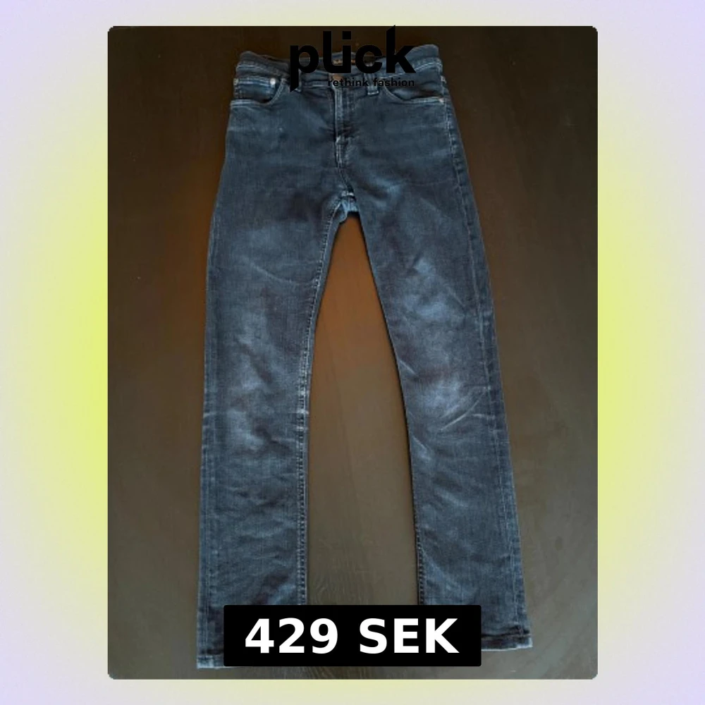 Säljer ett par igentligen mörkblå nudie jeans slim jeans som är nedtvättade så ser mer ut som svarta enligt mig. Modellen är high Kai och är synligt använda men i bra skick. Den ända riktiga defekten är hålet på benet på bild 5 men man ser knappt in och inget som direkt märks när man använder dem!