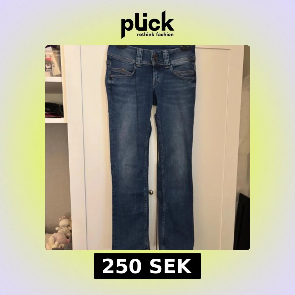 Säljer ett par klassiska blå jeans från pepe jeans modell Venus med straight fit och låg midja. Jeansen har dubbla knappar i midjan, fem fickor och snygga detaljer på bakfickorna. Perfekta för en avslappnad och tidlös look.