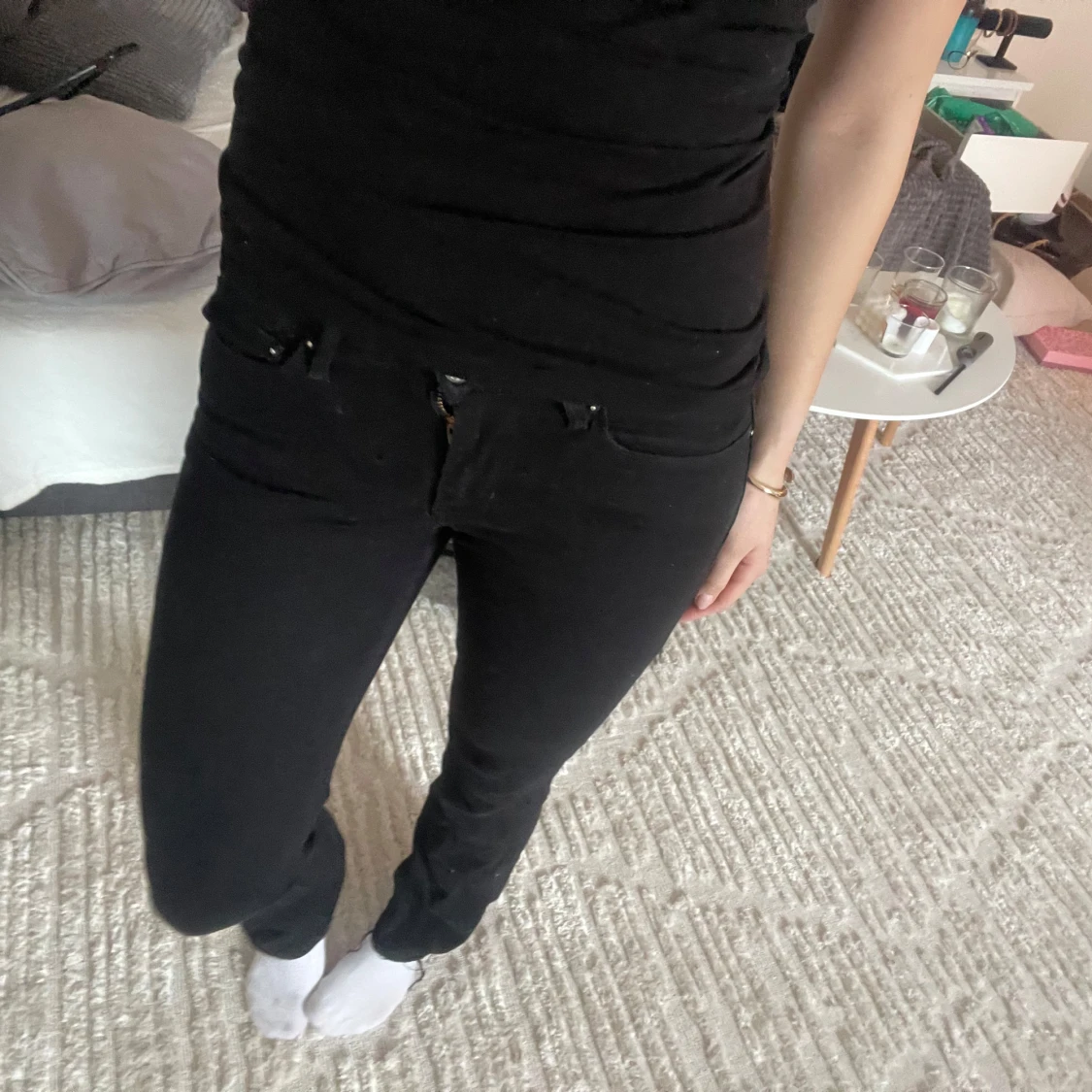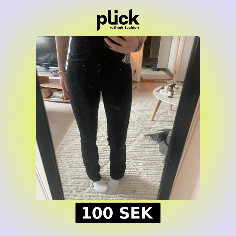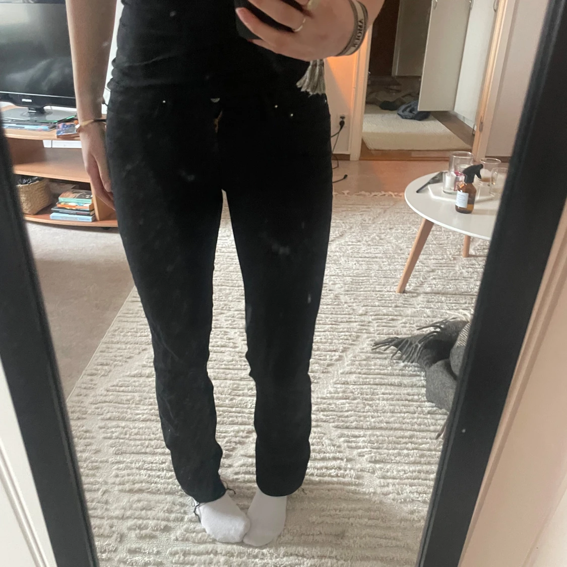 Snygga raka jeans som tyvärr är lite för små för mig som är 170 skulle säga att det är storlek s/xs. Jag har själv sorterat upp dem i benen så att dom ska bli lite längre där av lite trådar