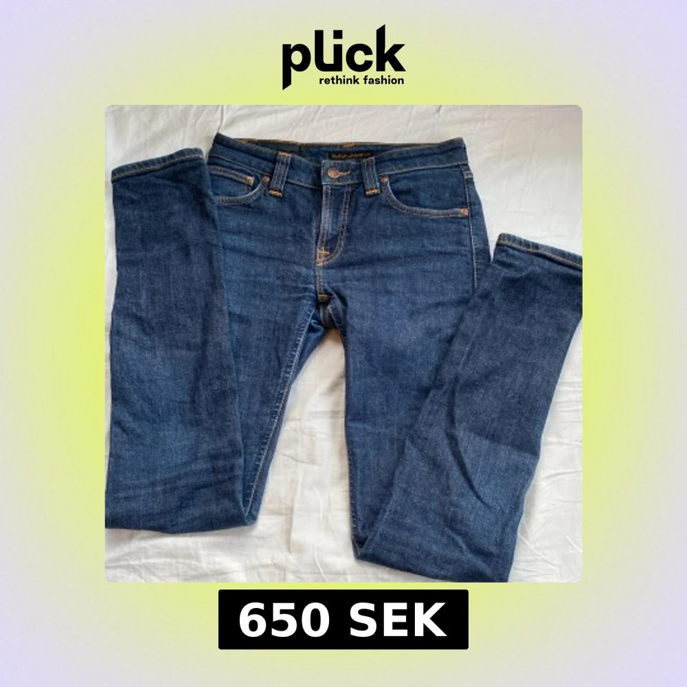 Snygga blå jeans från Nudie Jeans i ekologisk bomull. De har en klassisk femficksdesign med orange sömmar och en knappgylf. Perfekta för en avslappnad stil.