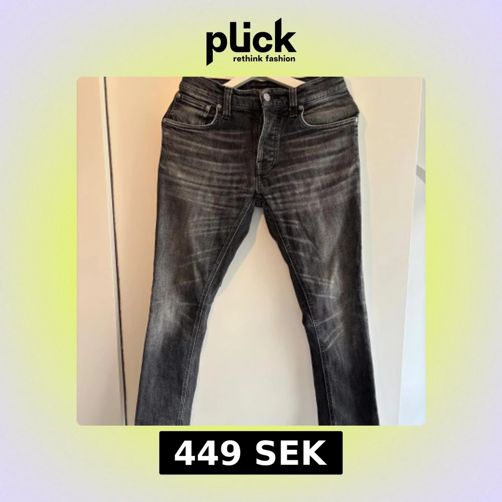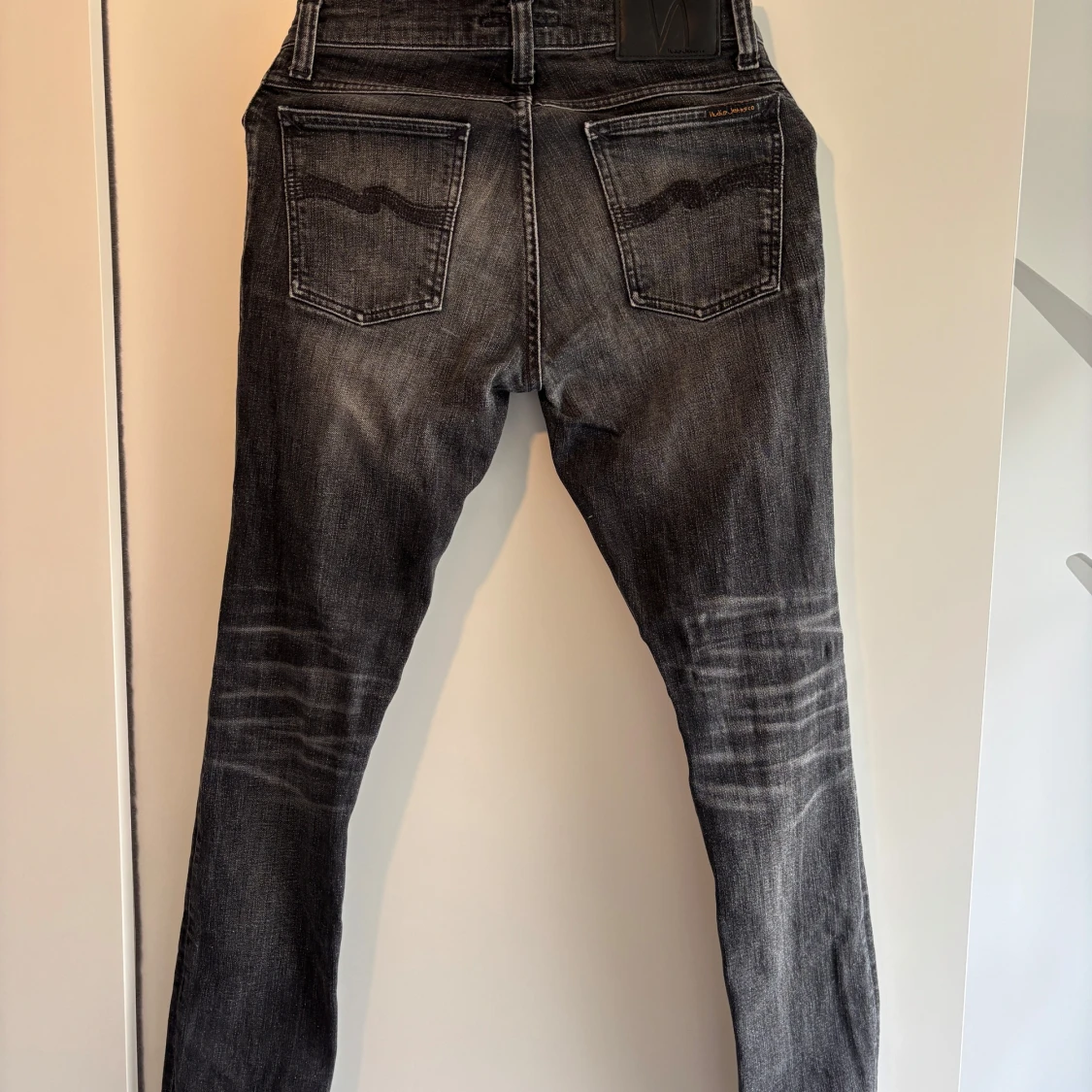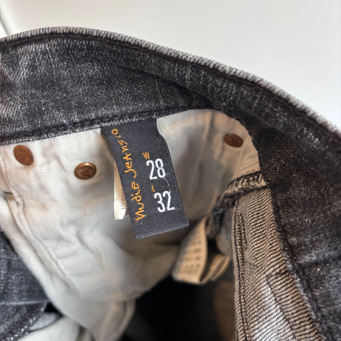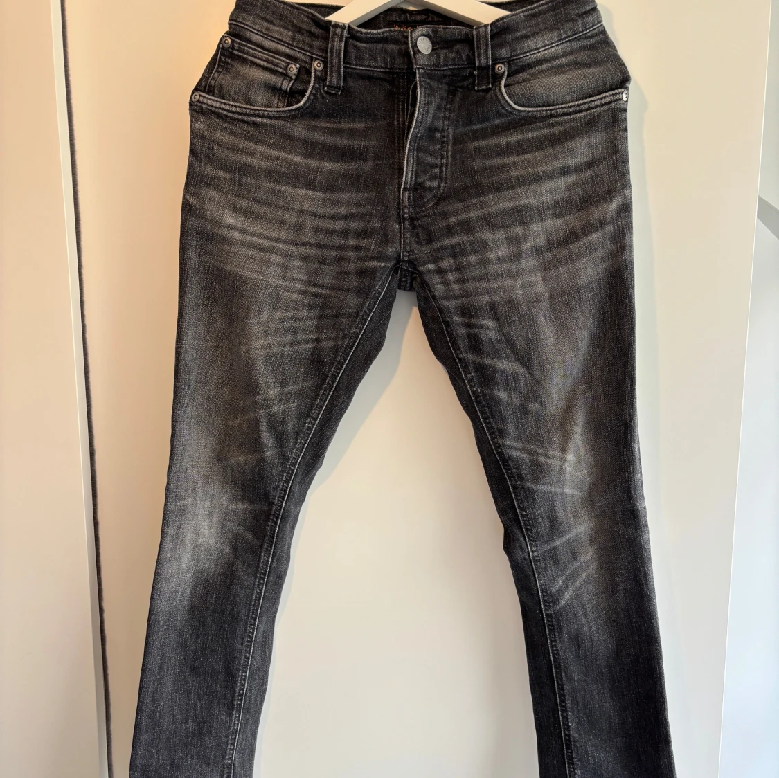 Snygga svarta jeans från Nudie Jeans med en klassisk femficksdesign. De har en diskret tvättad look och är perfekta för en stilren vardagsoutfit. Storleken är 28W 32L