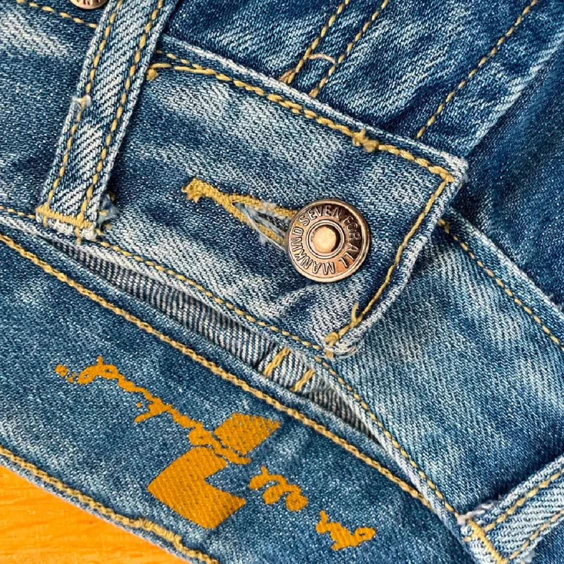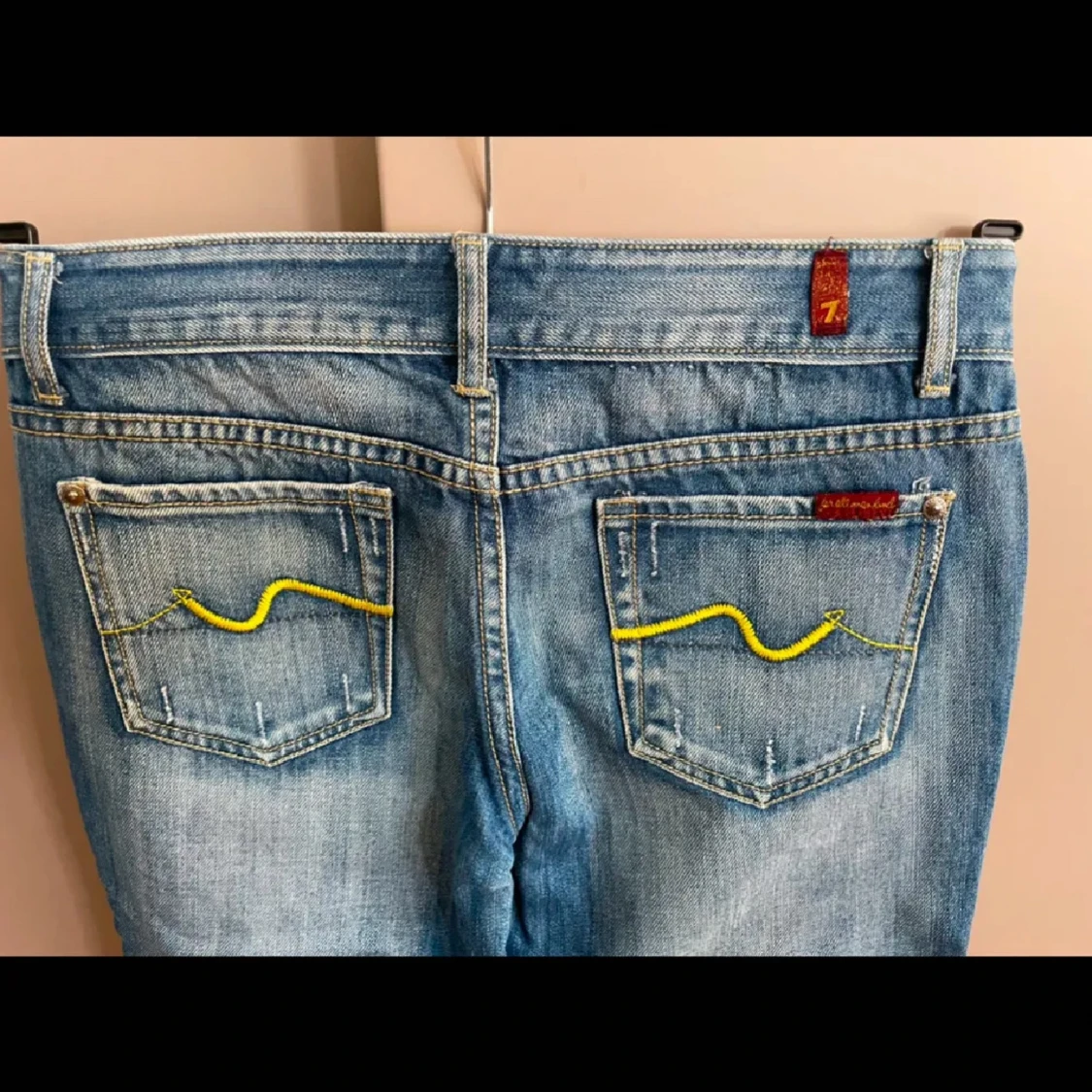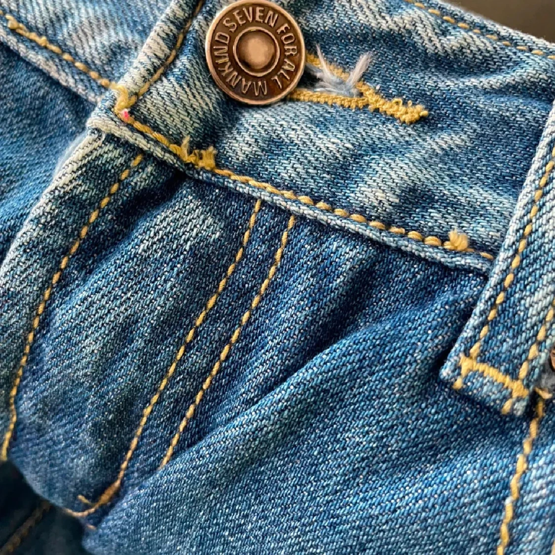 Snygga blå jeans från 7 For All Mankind med klassisk femficksdesign. Jeansen har slitna detaljer och ljus tvätt för en cool, avslappnad look. Tillverkade i mjukt denim med gul kontrastsöm.
