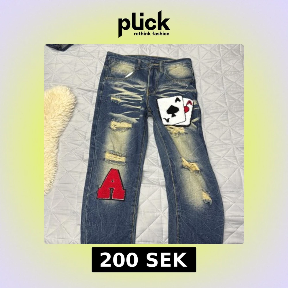 Jeans med patches, vet ej vart ifrån men inte något känt märke. Hör av dig om du har frågor.