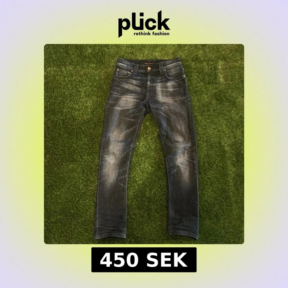 Säljer ett par mörk blåa jeans från Nudie Jeans med klassisk femficksdesign och snygga slitningar framtill och baktill. Jeansen har raka ben och normal passform, samt detaljer med nitar och knappstängning.