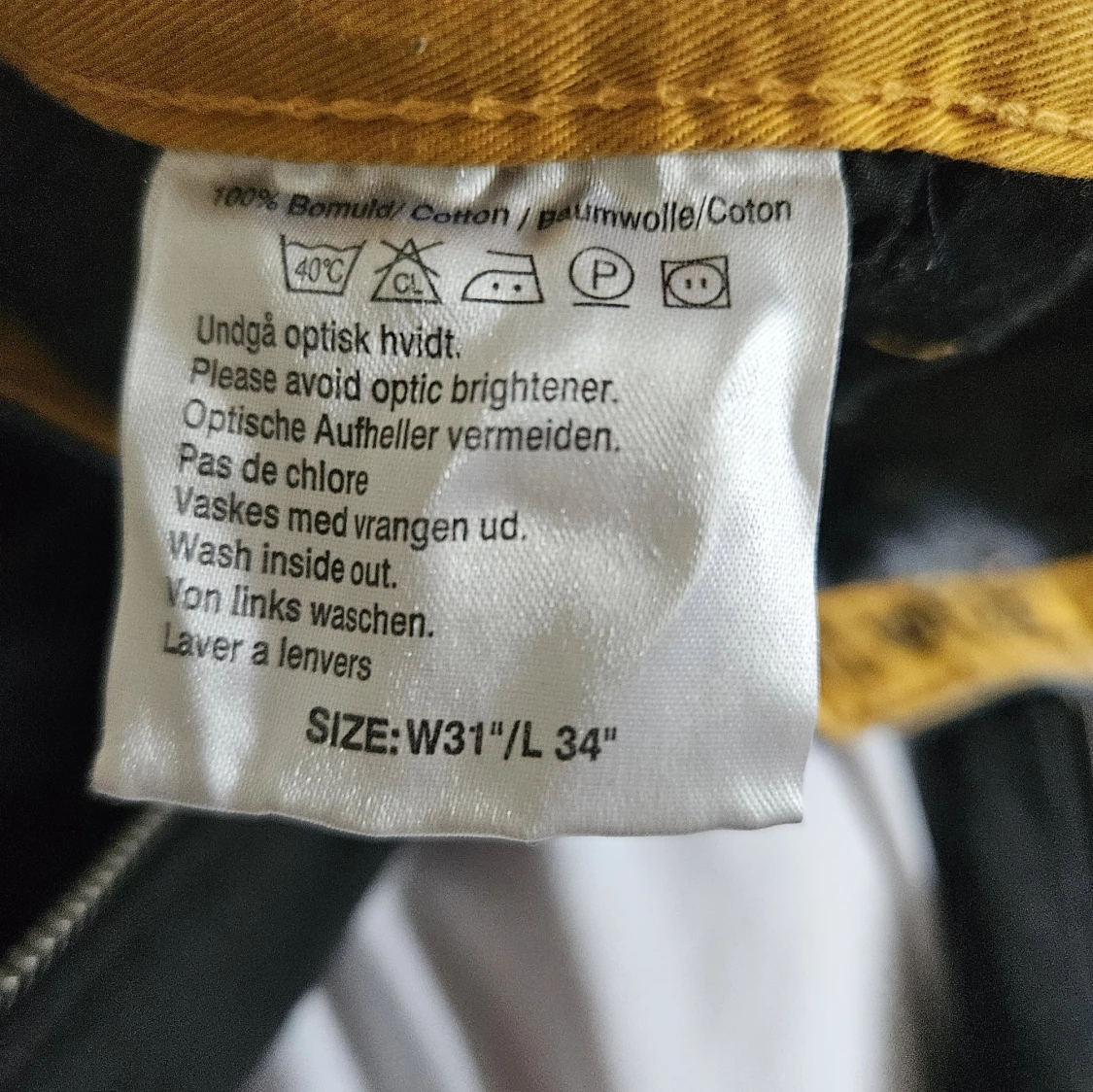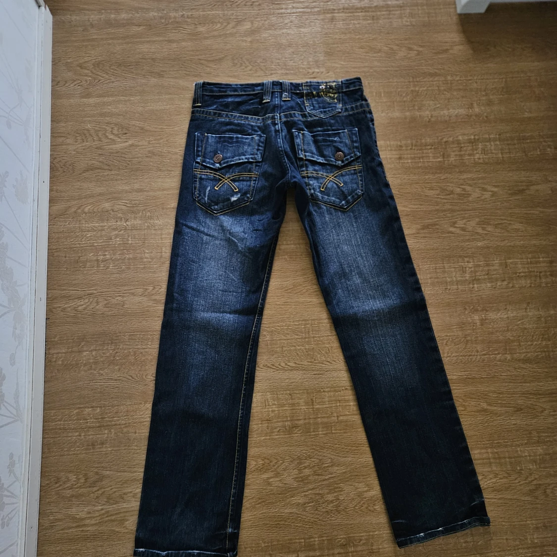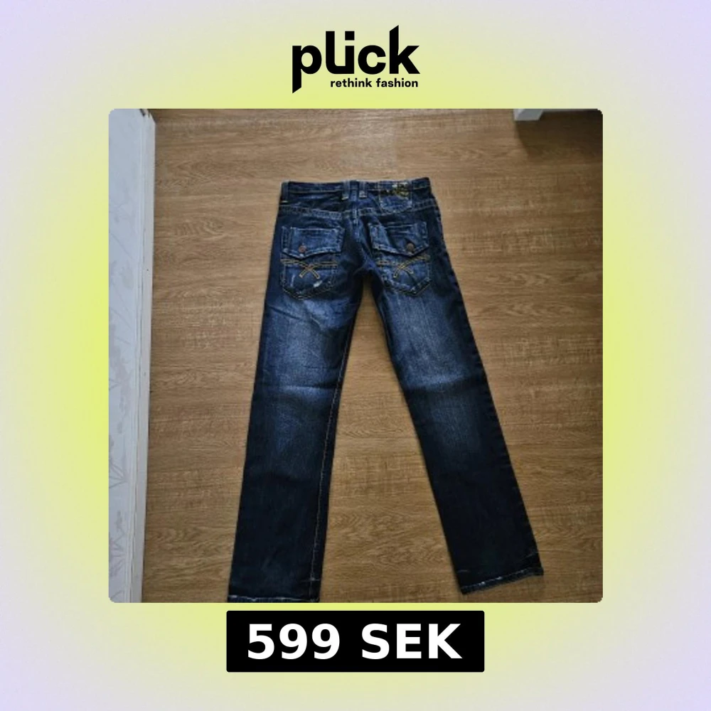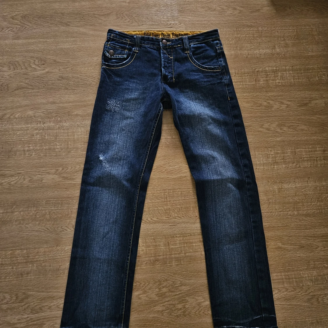 Säljer ett par mörkblå jeansbyxor från Solid Jeans med snygga kontrastsömmar och stora bakfickor med knapp och dekorativ gul söm. Byxorna har klassisk femficksdesign och raka ben. Tillverkade i 100% bomull. W31/L34 priset går att diskutera