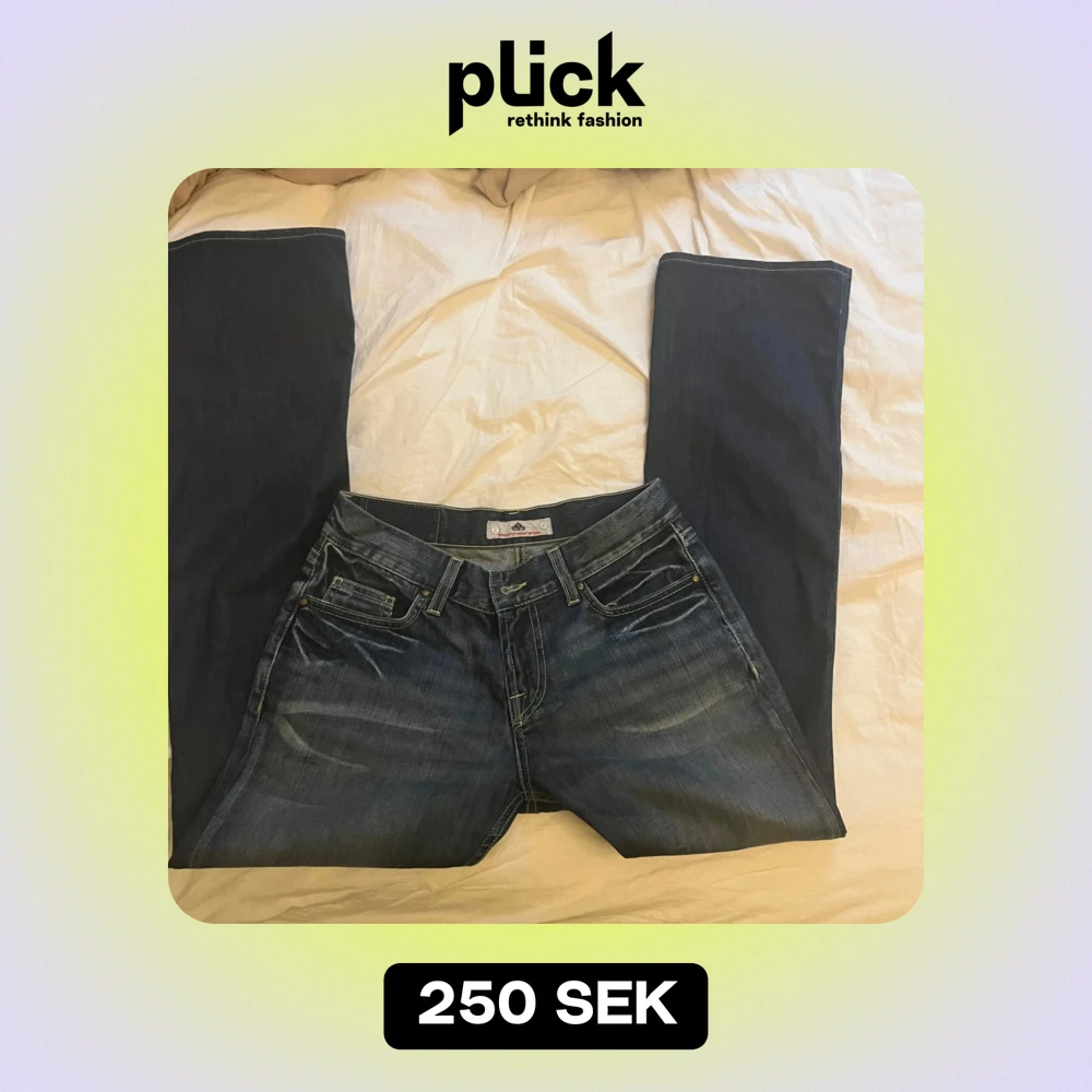 Ljusblå bootcut jeans låg midja - Säljer ett par ljusblå vintage bootcut jeans med låg midja. Köpt från en vintagebutik i Paris!!❤️Xs-S! WAIST 40cm, INSEAM LENGTH 82cm