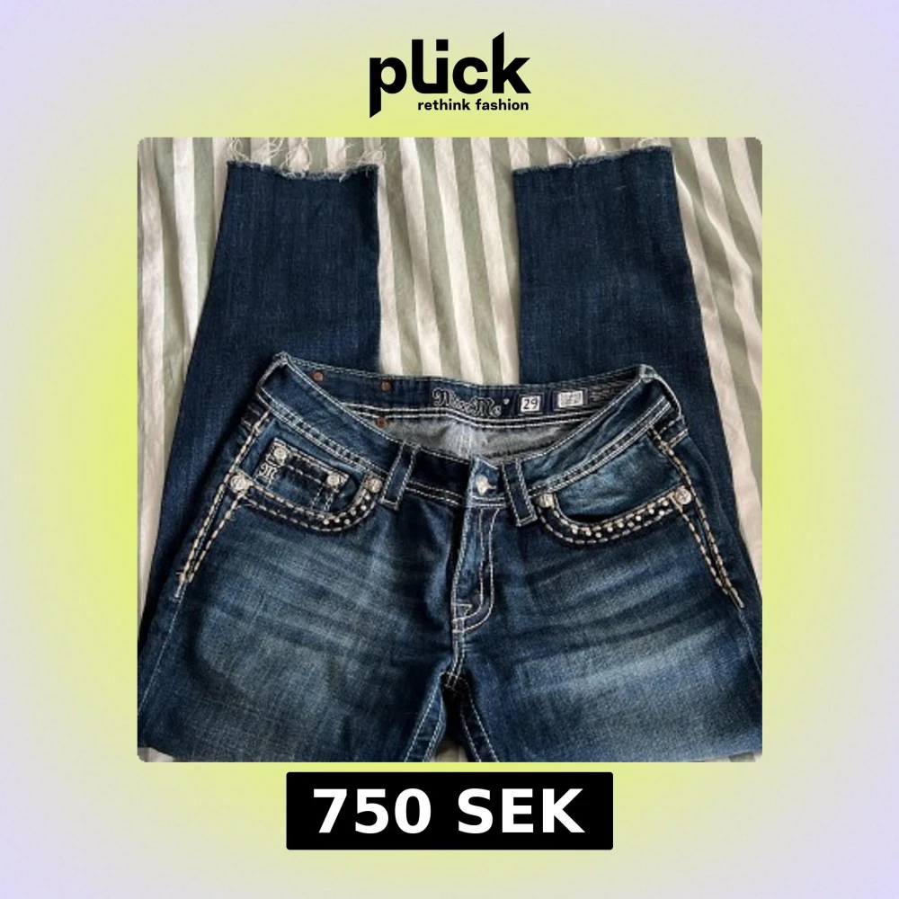 Säljer ett par mörkblå jeans från Miss Me med snygga slitningar och dekorativa sömmar samt nitar på fickorna. Byxorna har raka ben med råa, avklippta benslut och klassisk femficksdesign. Perfekta för dig som gillar detaljer och unik stil.