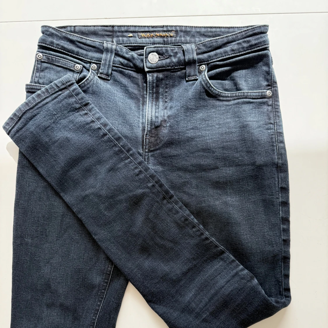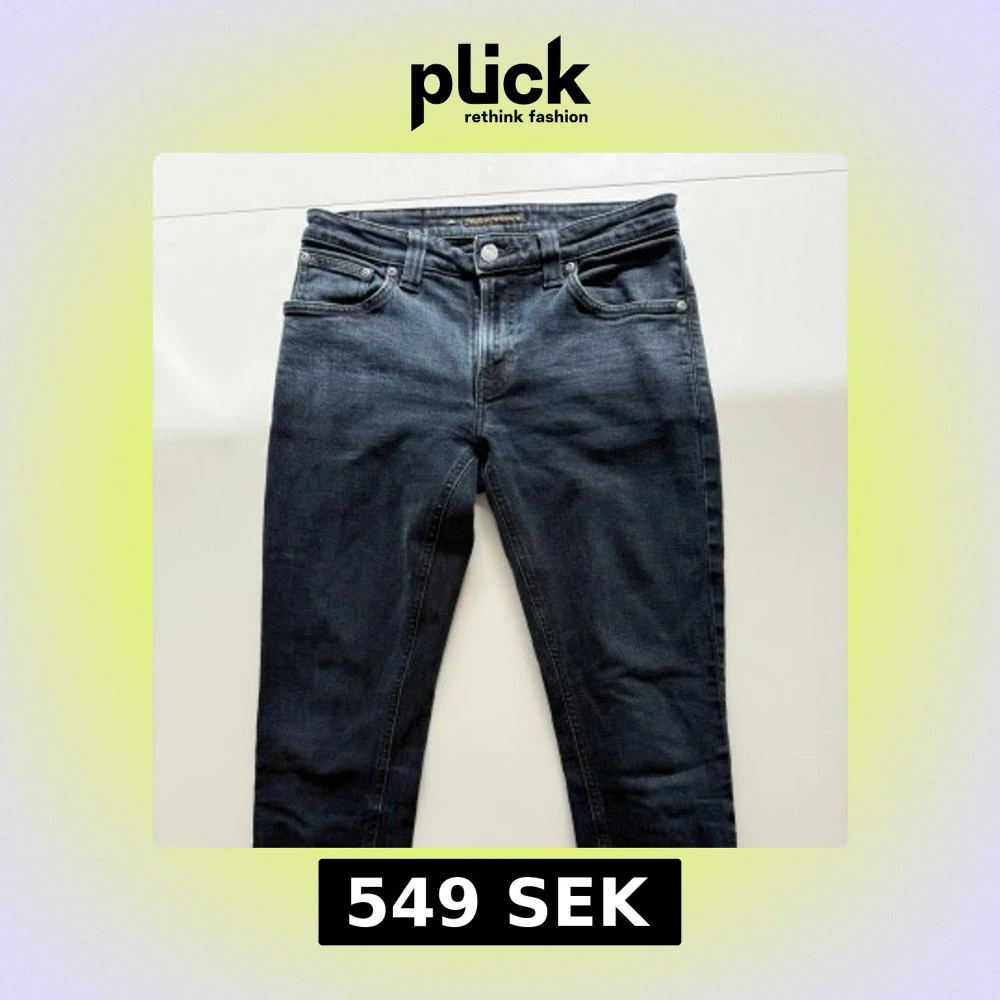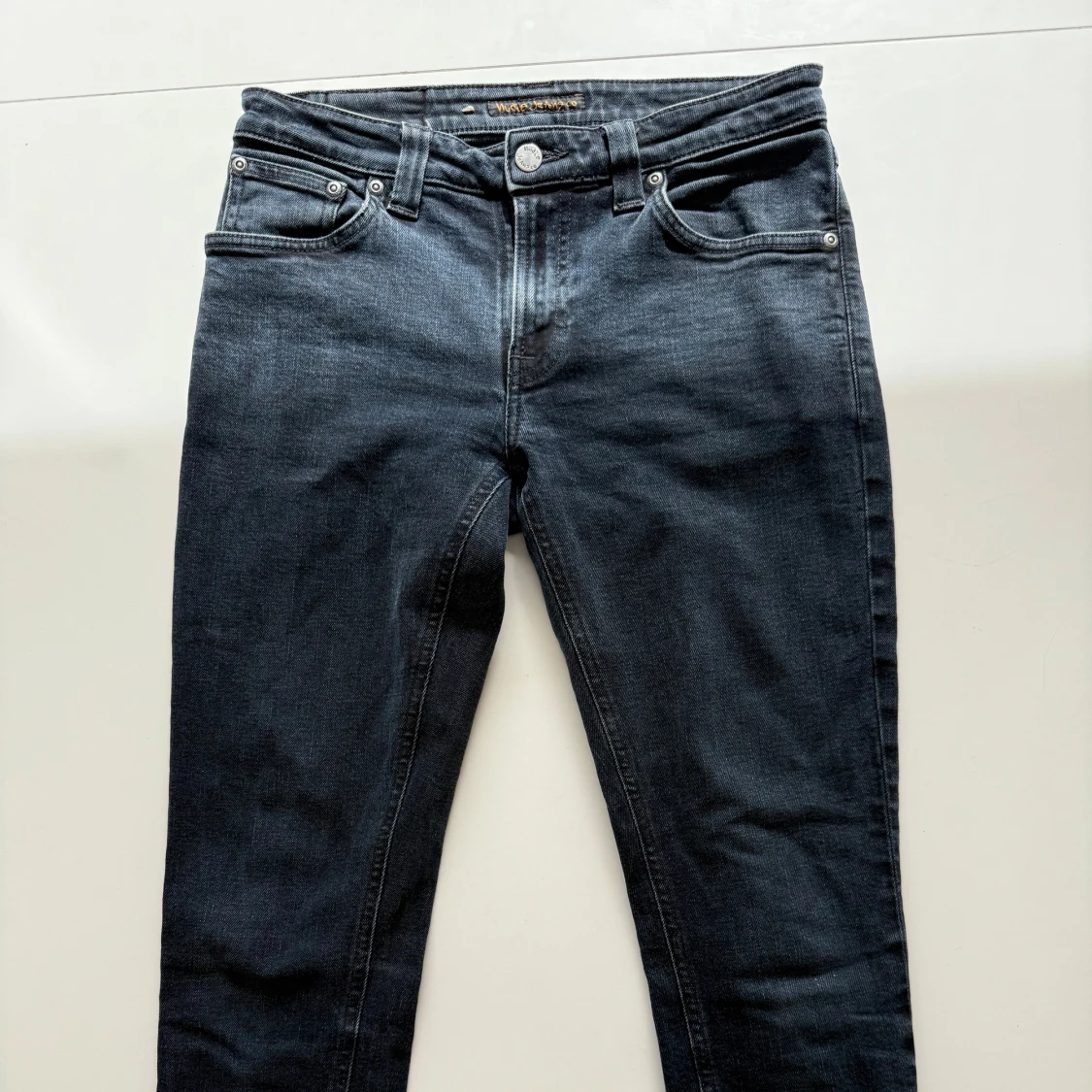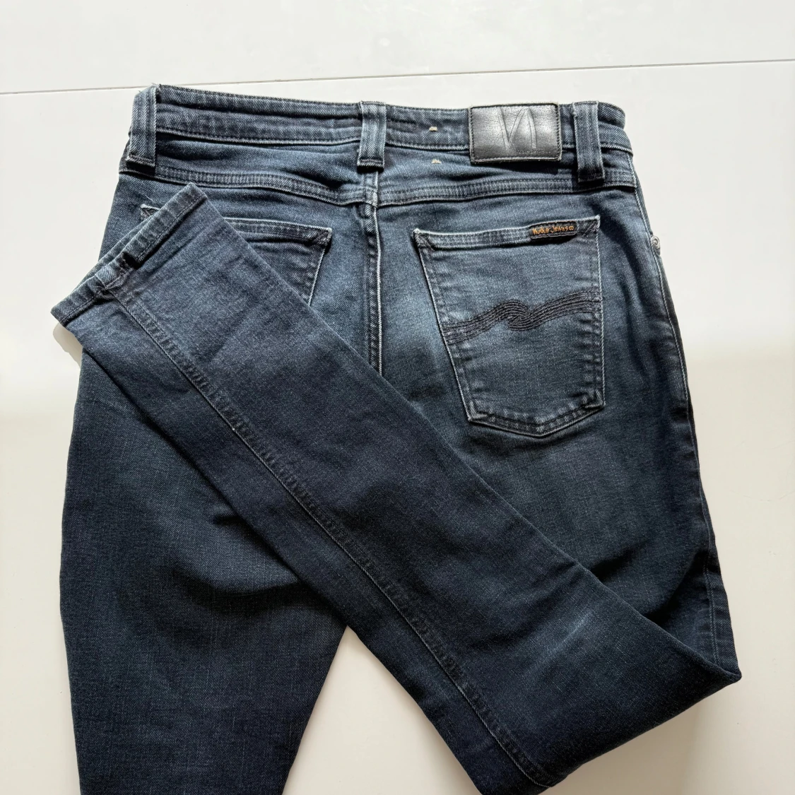 Säljer ett par mörkblå jeans från Nudie Jeans med klassisk femficksdesign och silverfärgade knappar. Jeansen har raka ben och normal passform, perfekt till vardags. Snygga detaljer på bakfickorna och diskret logga.
