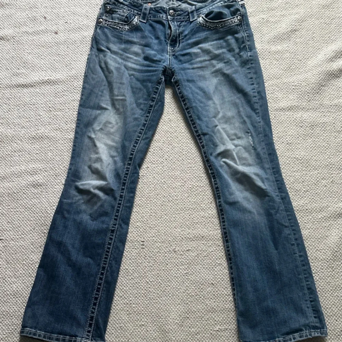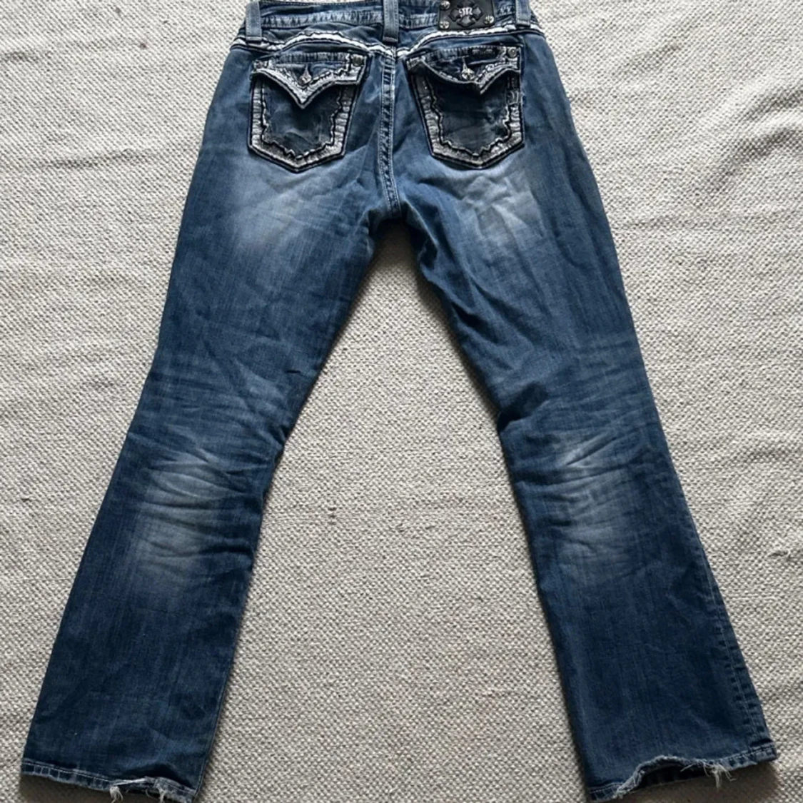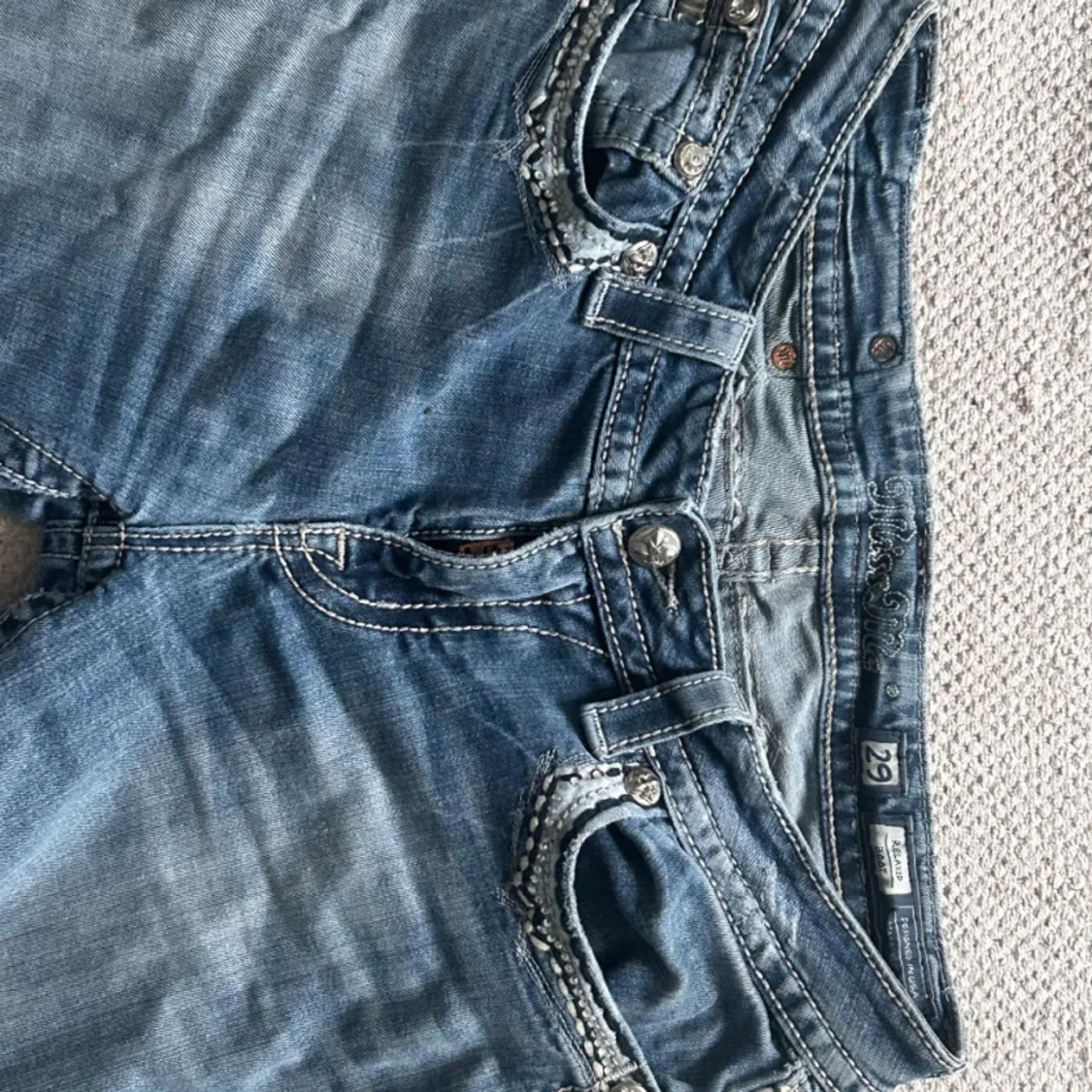 lägger ut mina miss me jeans nu då dem är för stora på mig, dem passar på längden men inte i storleken, jag är 162 för jämförelse. dem sitter dåligt i midjan och runt låren men dem går fortfarande att andvända. fint skick saknar en knapp på läder märket och få detaljer, inget man märker men därav priset, pris är diskuterbart vid snabbt köp!