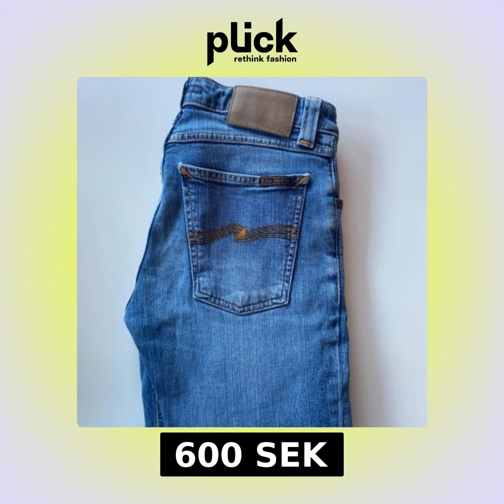 Säljer ett par klassiska blå jeans från Nudie Jeans med raka ben och snygga kontrastsömmar på bakfickorna. Jeansen har normal passform, knappgylf och är tillverkade i bomull. Perfekta för dig som gillar en tidlös stil.