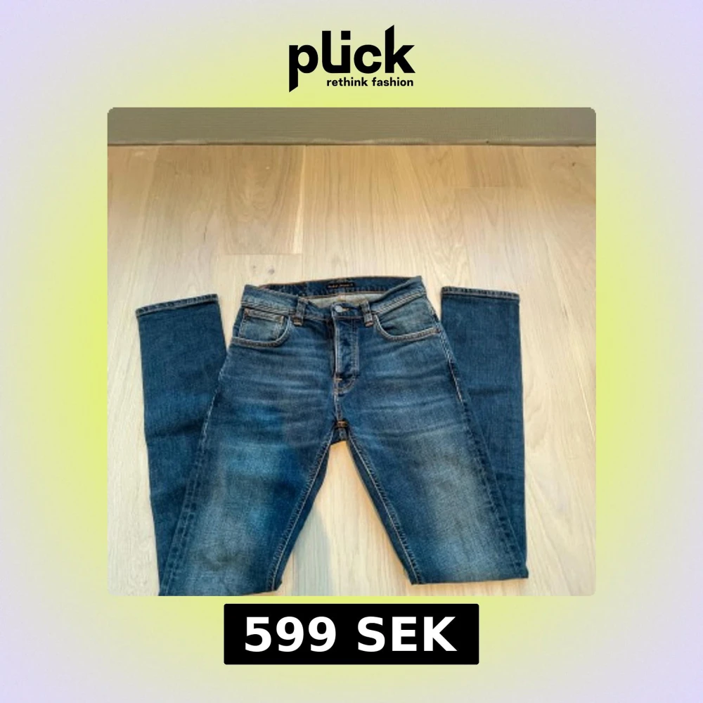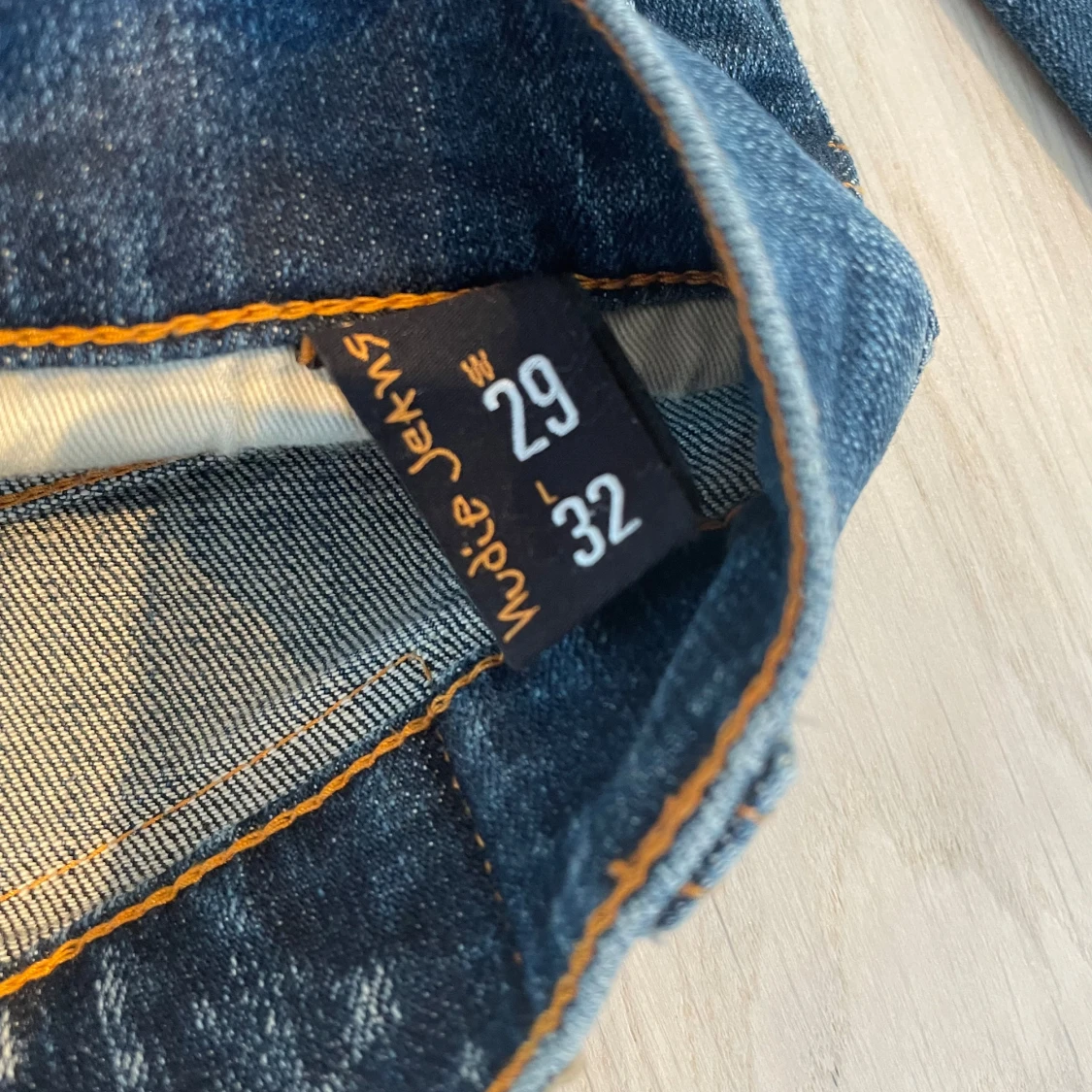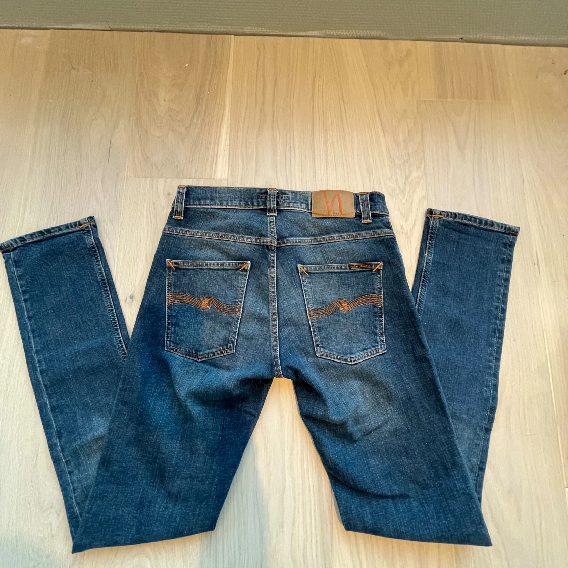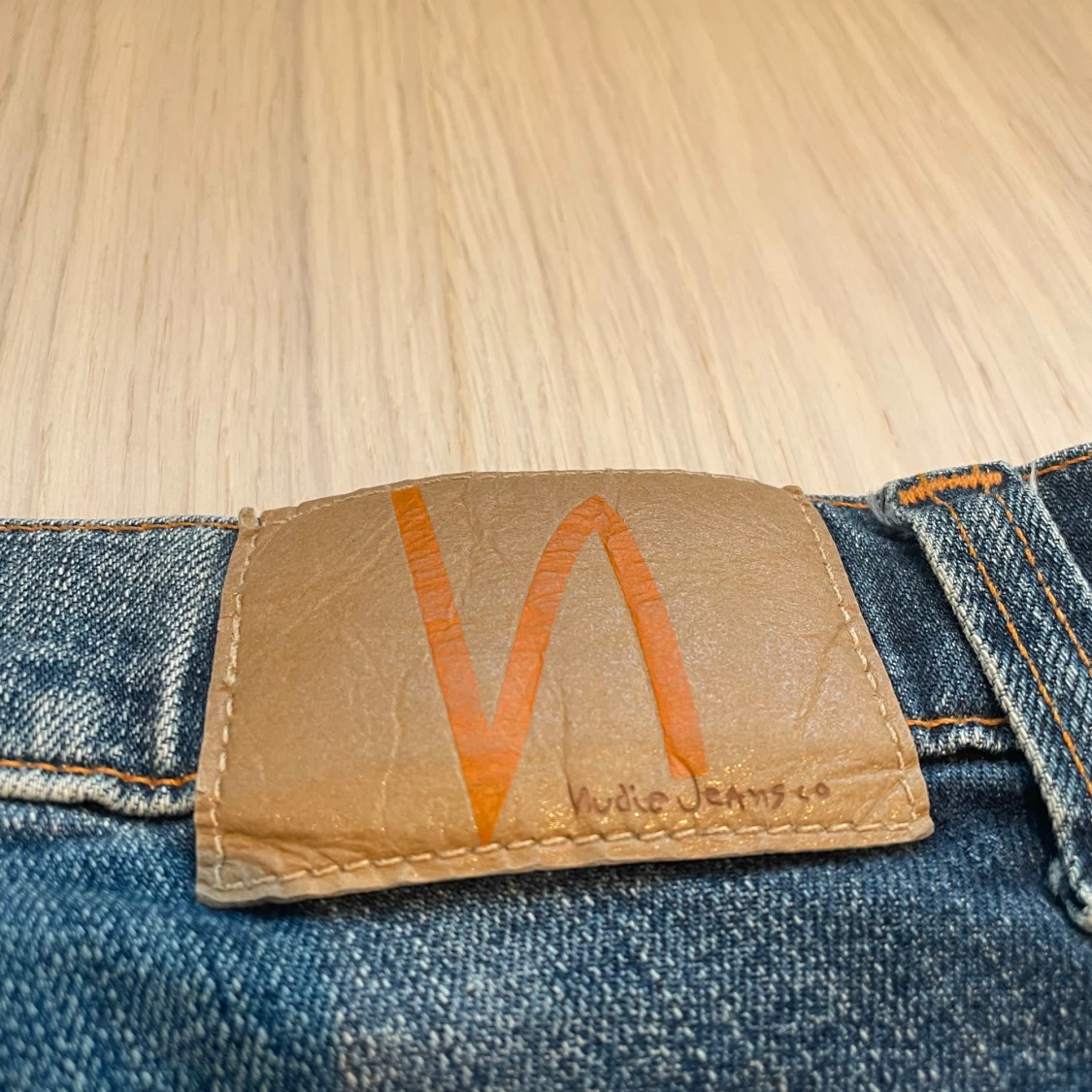 Snygga blå jeans från Nudie Jeans Co med klassisk femficksdesign och orangea kontrastsömmar. Jeansen har en rak passform. Bakfickorna har Nudie Jeans signaturbrodyr och läderpatch i midjan.