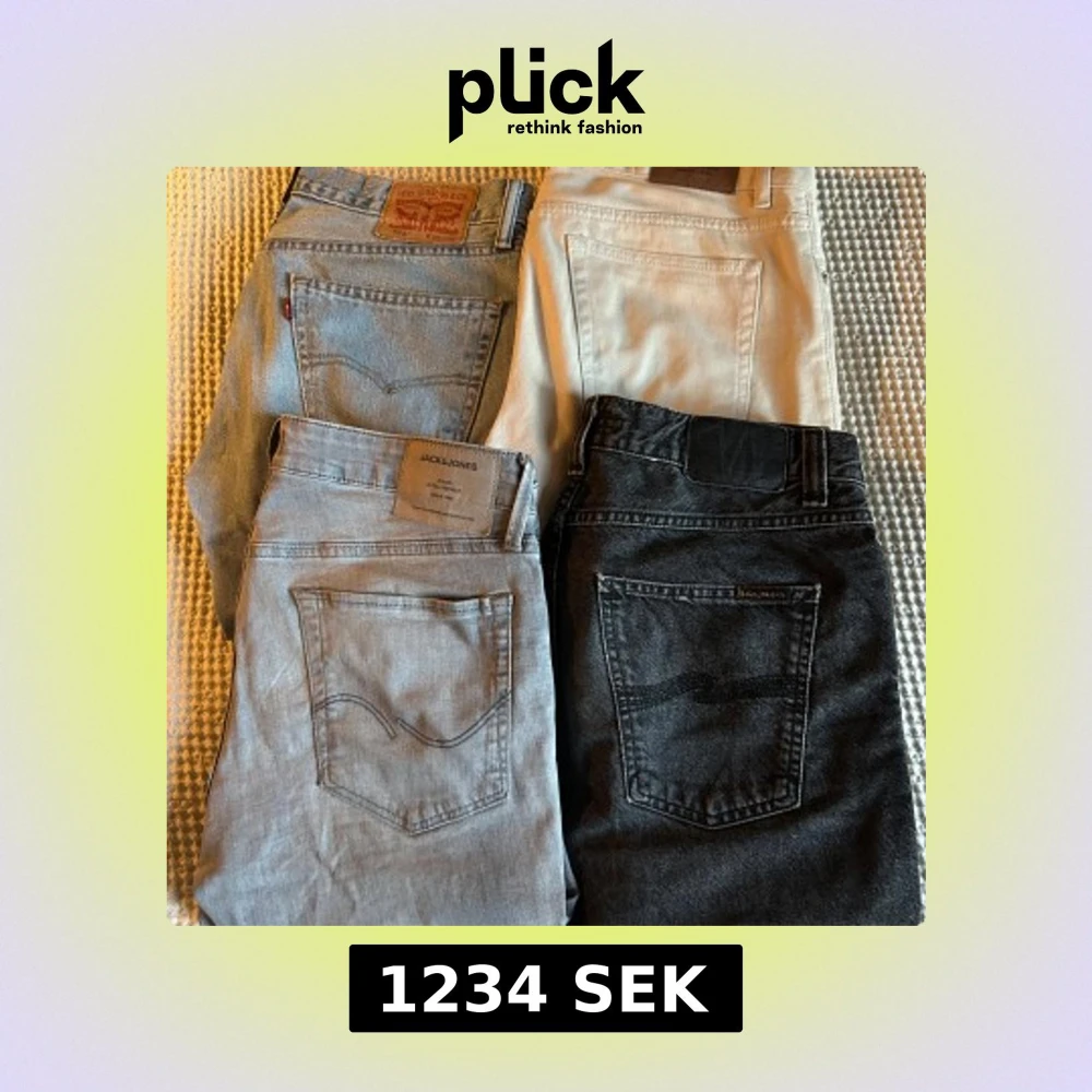 Säljer fyra par jeans: ett par ljusblå Levi's 505 30/32, ett par beigea/vita Sweet SKTBS jeans W29, ett par ljusgrå Jack & Jones 32/30 och ett par svarta nudie jeans 31/32. Alla har klassisk femficksdesign och raka ben. Perfekta för dig som vill variera din stil med olika färger och märken. Hör av dig vid frågor och funderingar och pris