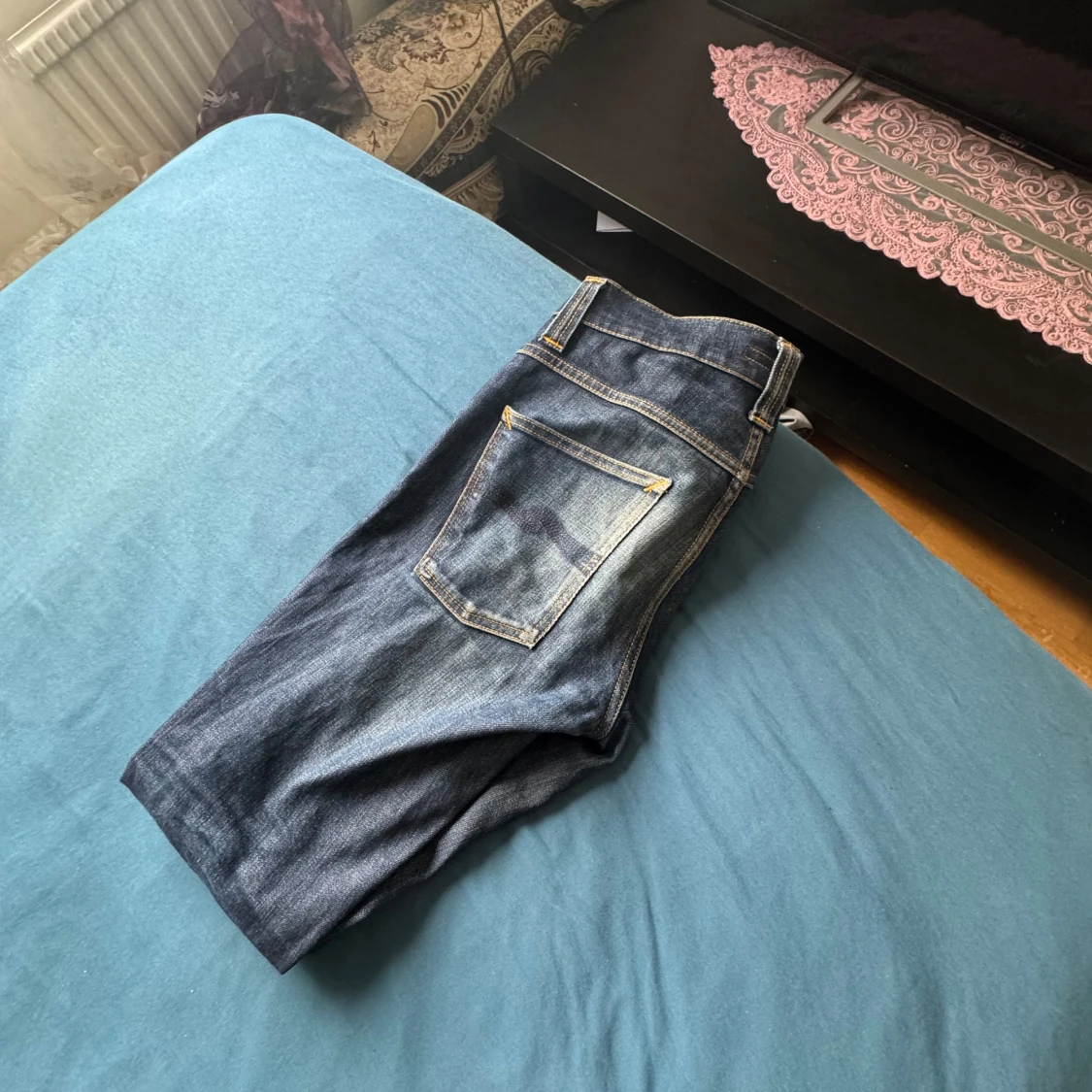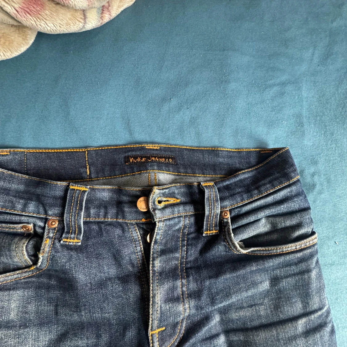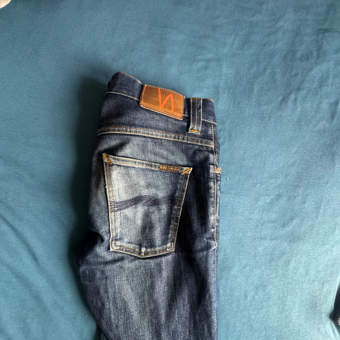 Säljer ett par mörkblå jeans från Nudie Jeans med klassisk femficksdesign och orangea sömmar. Byxorna har en rak passform och normal midja, perfekta till vardags. Nudie-logga på bakfickan och läderpatch bak i midjan.