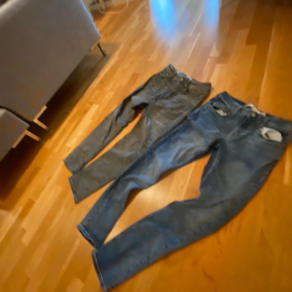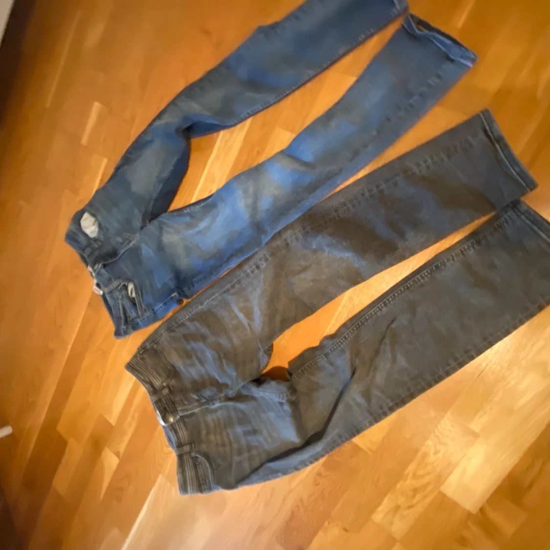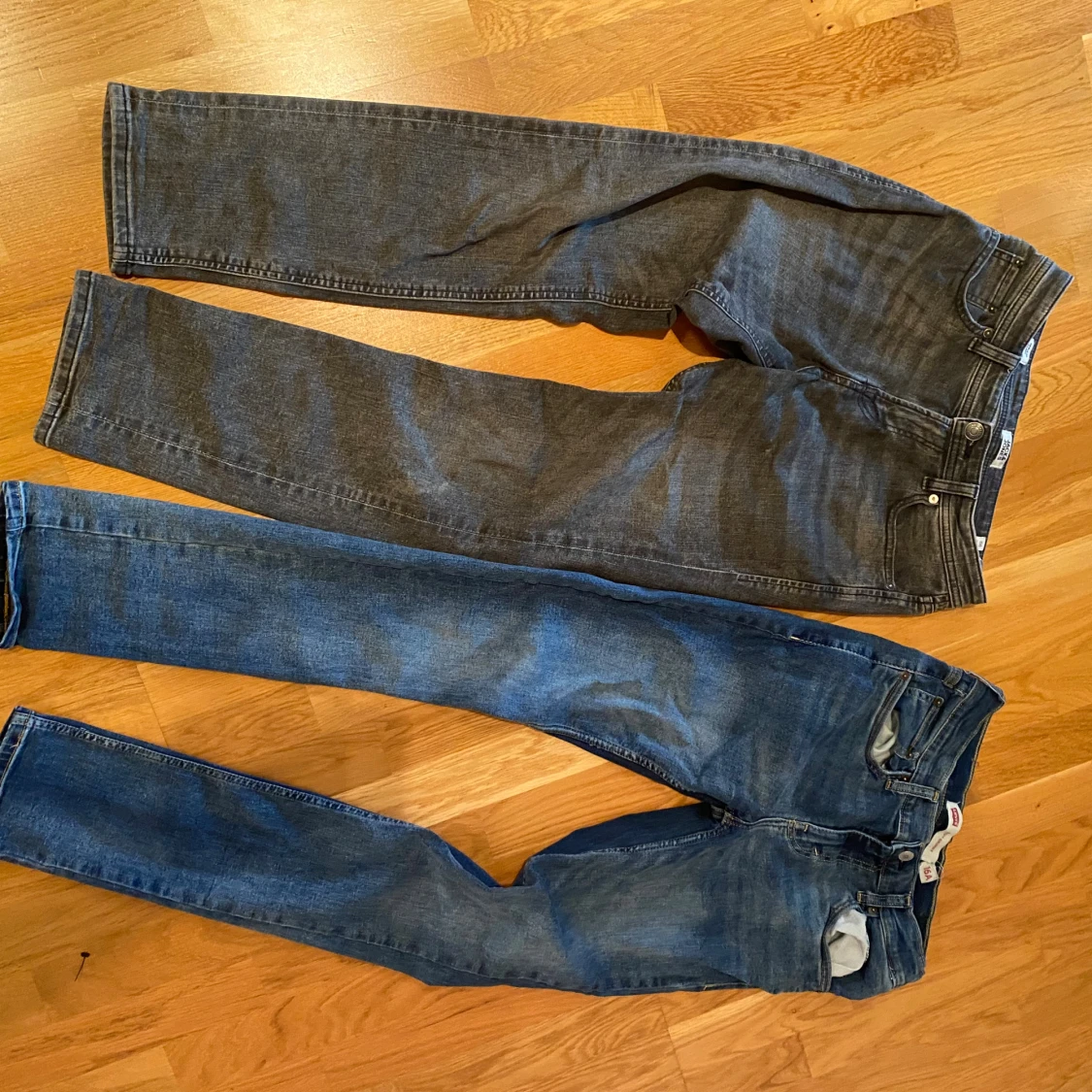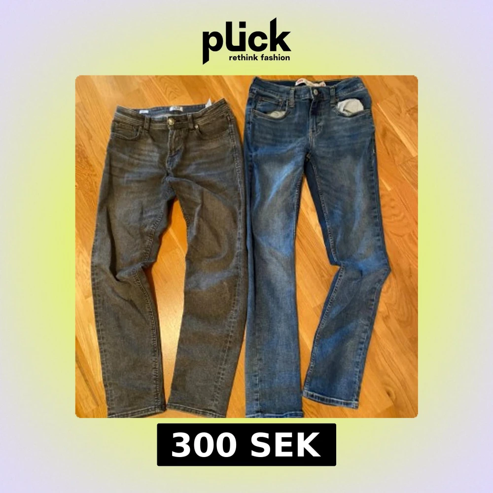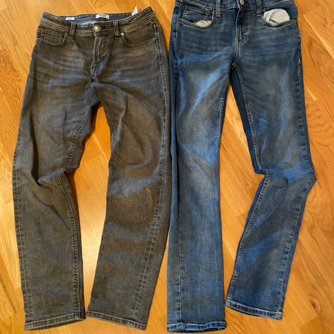 Säljer två par jeans, ett par i klassisk blå tvätt och ett par i mörkgrått. Båda har femficksmodell, smal passform och normal midja. Perfekta för dig som gillar en enkel och stilren look. Materialet är mjukt jeans-tyg med lite stretch för extra komfort.