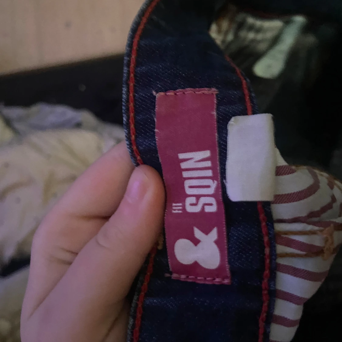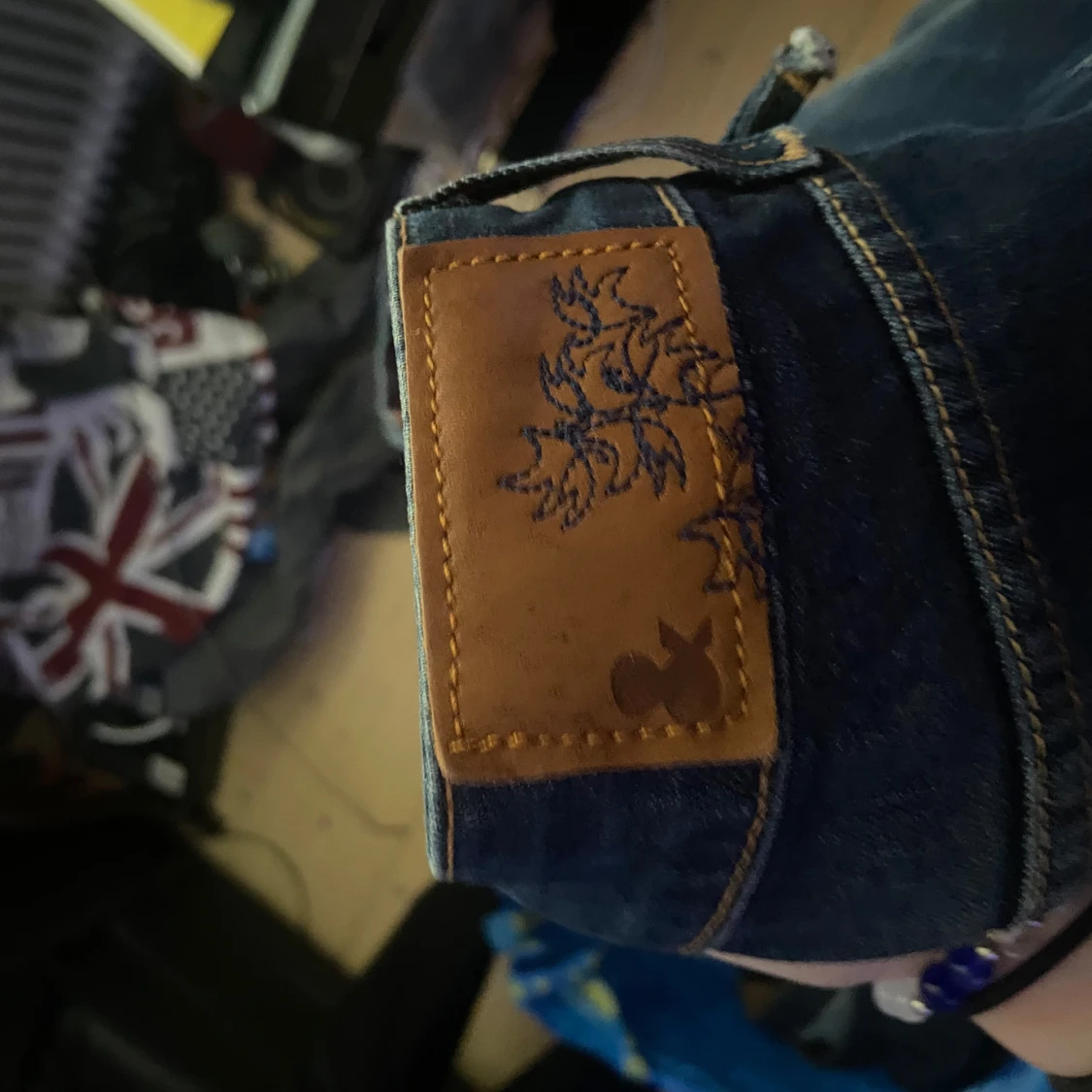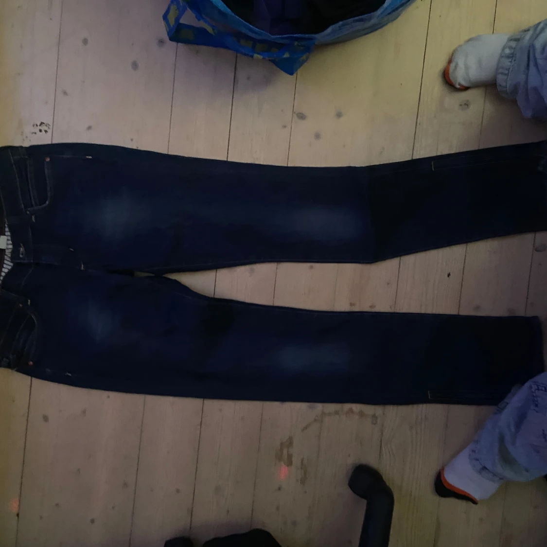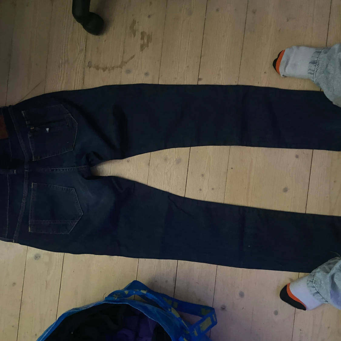 Snygga mörkblå jeans från N&SON med klassisk femficksdesign och läderdetalj vid midjan. Perfekta för en avslappnad stil.