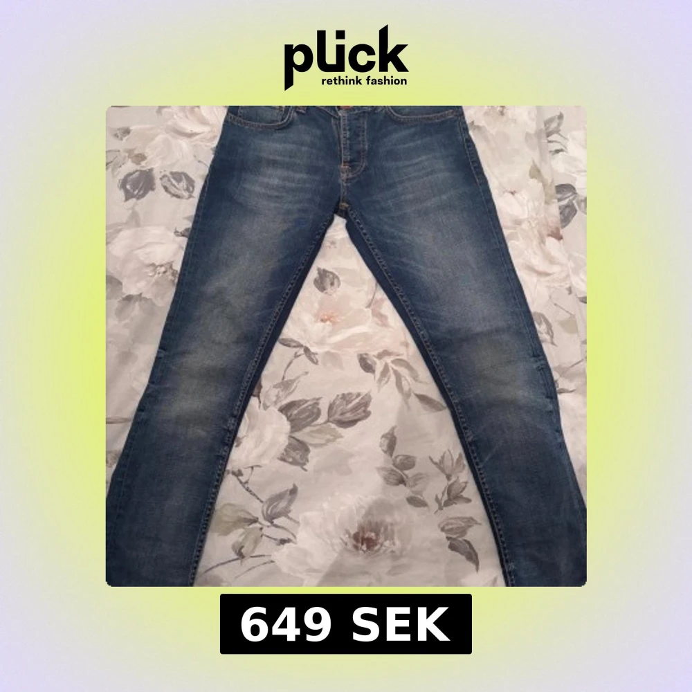 Säljer ett par klassiska blå jeans från Nudie Jeans Co i modellen W30 L30. Jeansen har orangea sömmar, fem fickor och snygg slitning framtill. Materialet är jeans och passformen är rak med normal midja. Perfekta för en avslappnad och stilren look.