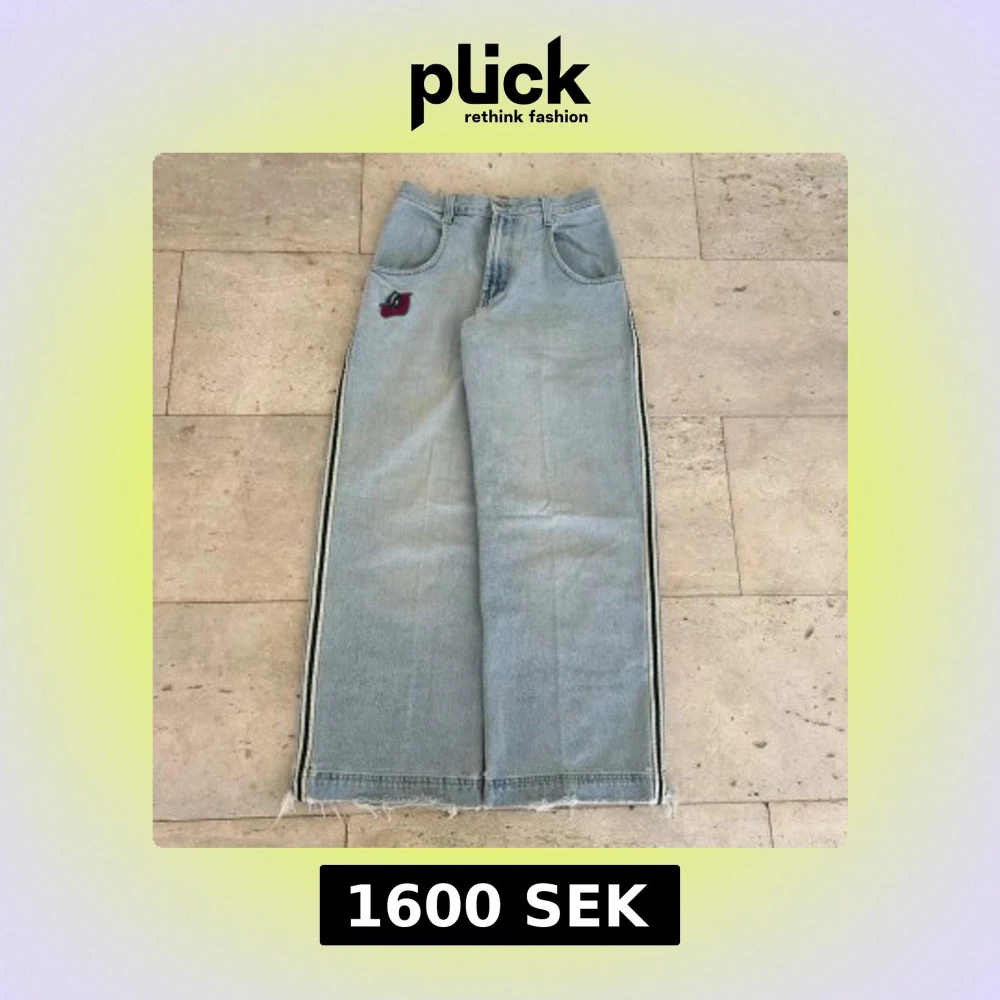 Ljusblå jeans från Skunk med breda ben och coola revärer längs sidorna. Jeansen har råa, fransiga benslut och en broderad detalj framtill. Tillverkade i 100% bomull för en klassisk denimkänsla. Perfekta för dig som gillar streetwear och unik stil.