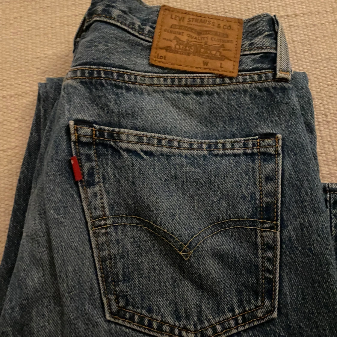 Säljer ett par klassiska Levi's jeans i blå denim. De har en snygg vintage-look med fem fickor och knappgylf. Perfekta för både vardag och fest! 🕺