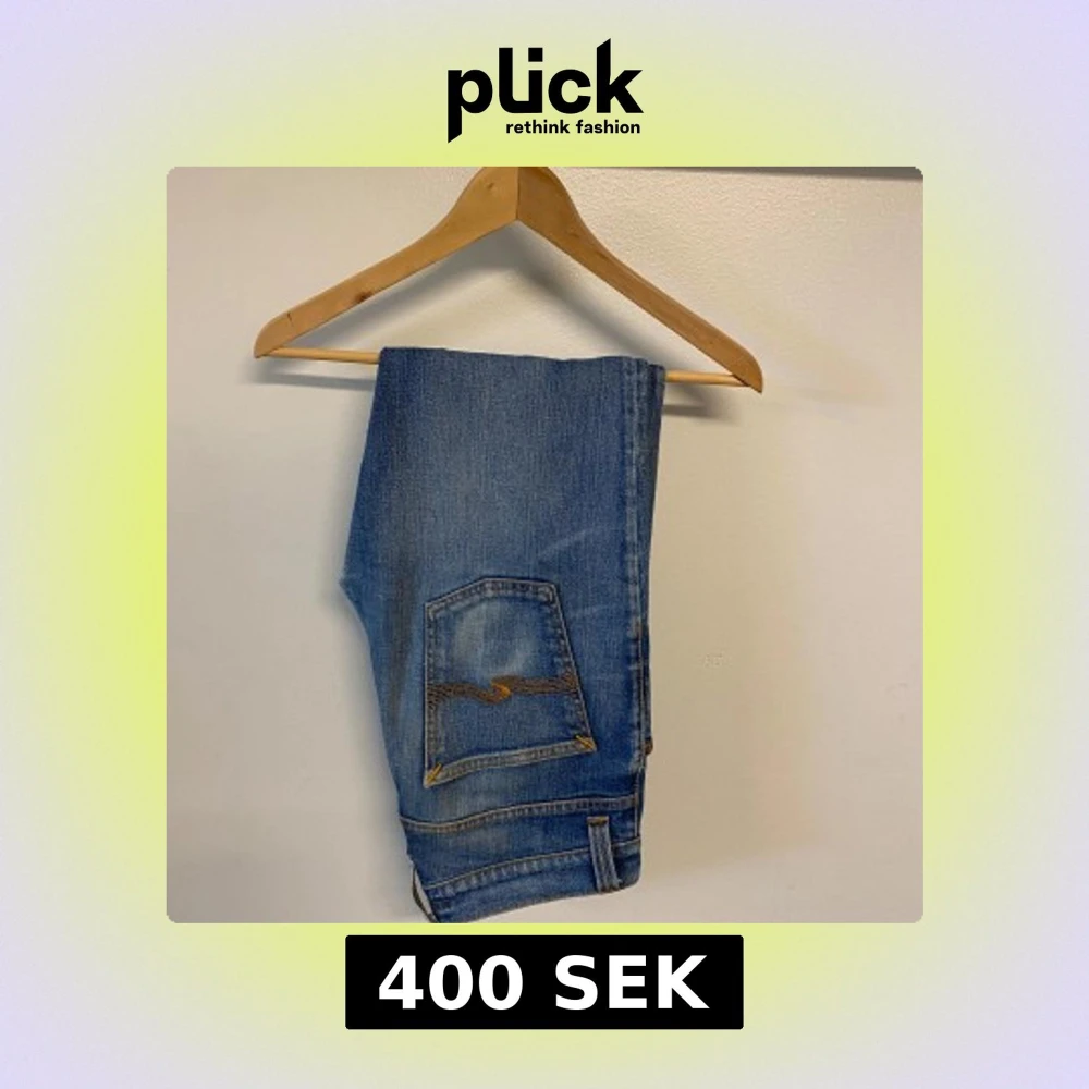 Säljer ett par klassiska blå jeans från Nudie Jeans med tydliga gula sömmar och ikonisk bakficka. Perfekta för dig som gillar en tidlös stil och vill ha ett par jeans som funkar till det mesta. Skriv om du har några frågor😁