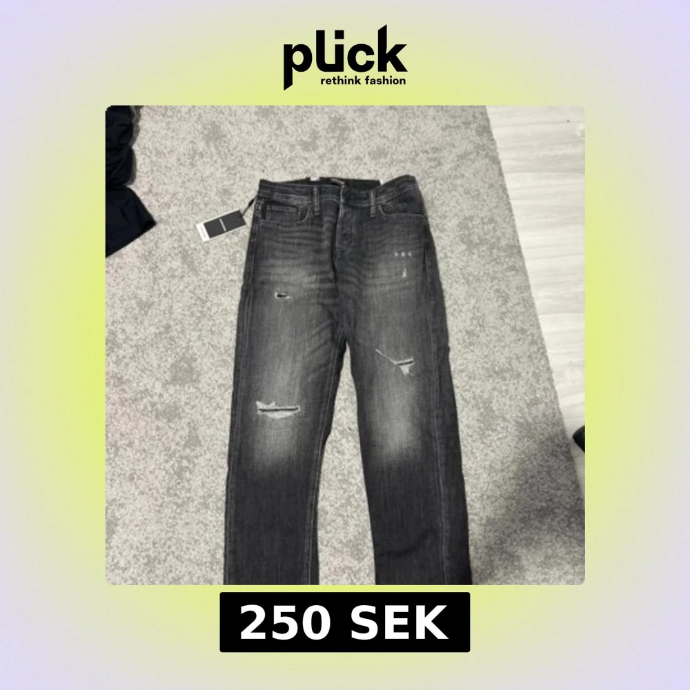 Säljer ett par grå jeans med slitningar och tvättade detaljer. Byxorna har fem fickor, dragkedja och knapp i midjan. Modellen är tapered och har en modern look med lite smalare ben nertill. Perfekta för dig som gillar en avslappnad men ändå stilren stil.