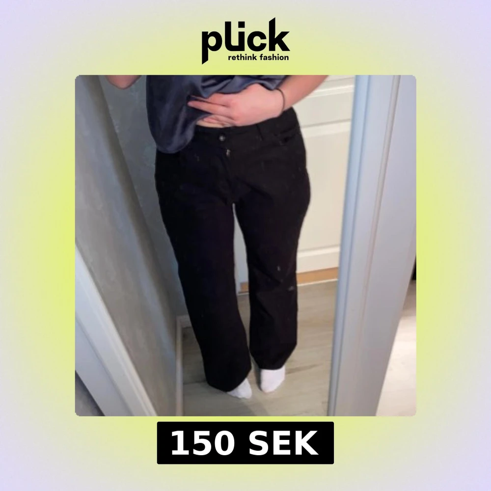 Säljer ett par svarta byxor i klassisk modell med normal passform och raka ben. Byxorna har dragkedja och knapp framtill. Perfekta till många olika outfits och enkla att matcha med andra plagg.