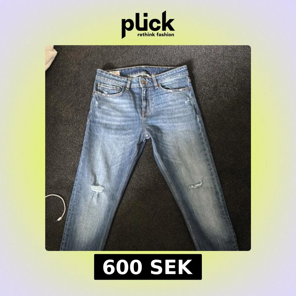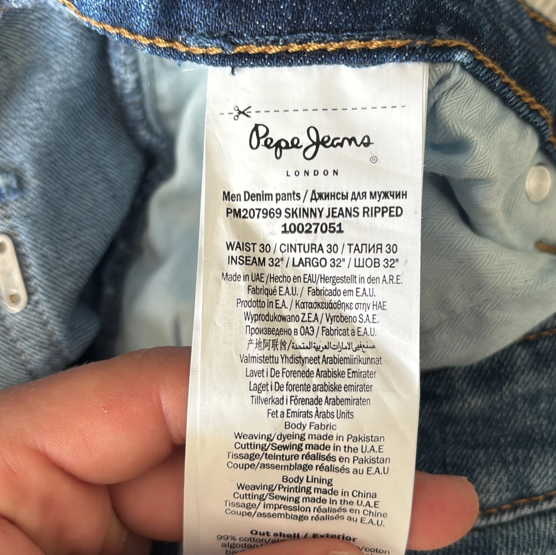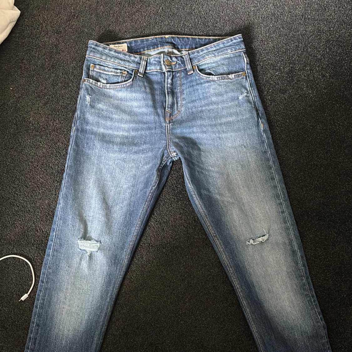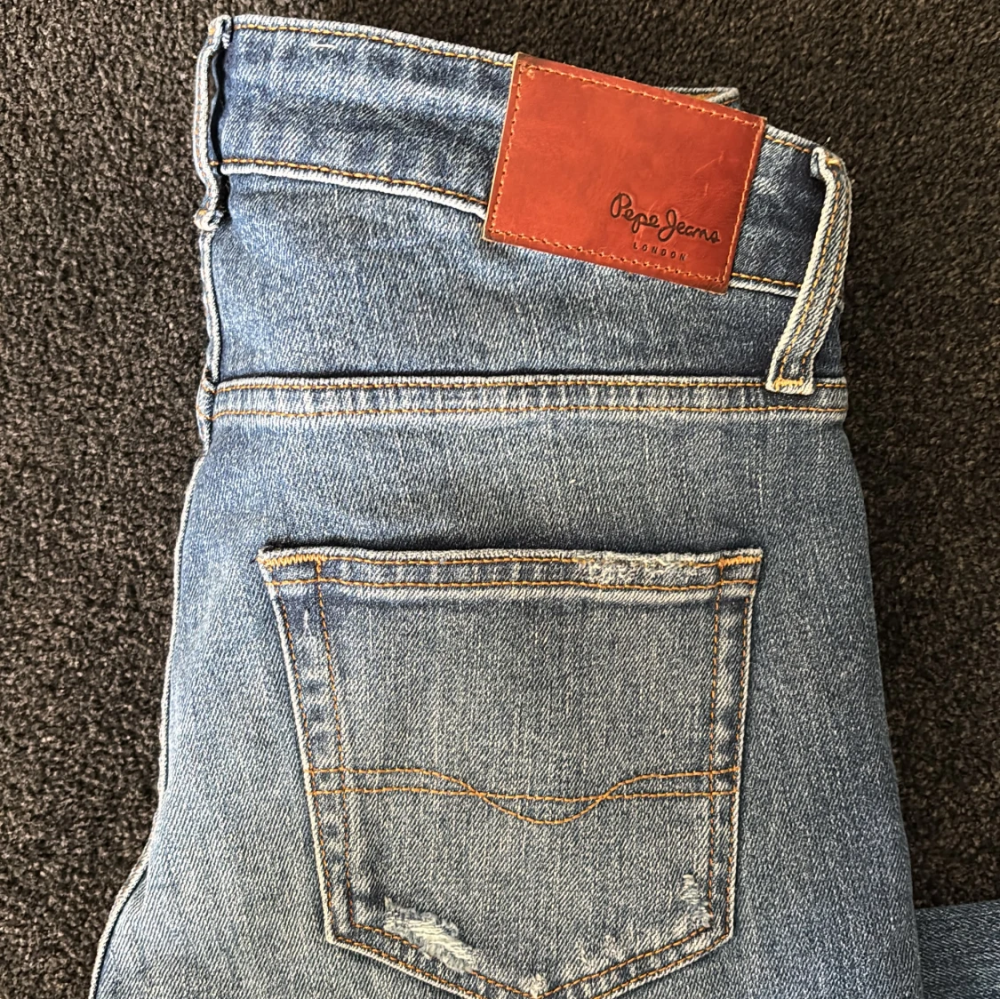 Säljer ett par blå jeans från Pepe Jeans med slitna detaljer vid knäna. Klassisk femficksmodell med läderpatch bak i midjan och orangea sömmar. Perfekta för dig som gillar en smal passform och lite tuffare look. Aldrig använda!!