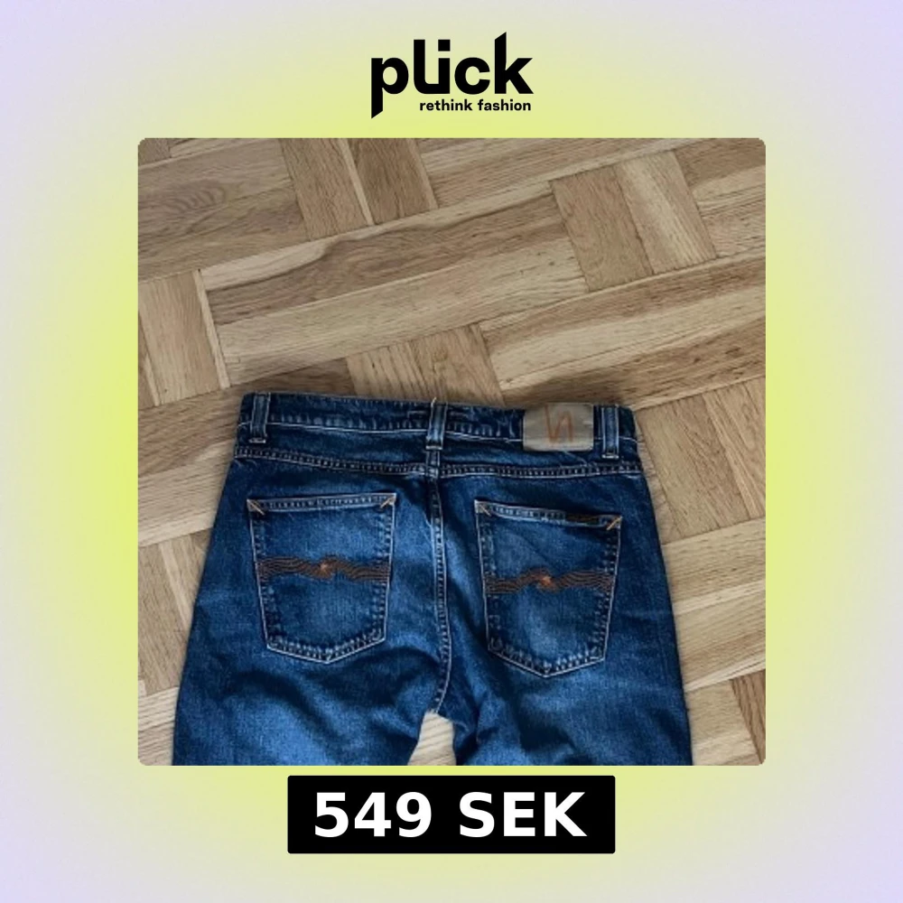 Säljer ett par klassiska mörkblå jeans från Nudie Jeans med raka ben och snygga detaljer på bakfickorna. Jeansen har normal passform och är tillverkade i slitstarkt denim. Perfekta för dig som gillar stilrena och tidlösa jeans. Modell lean Dean 31/32