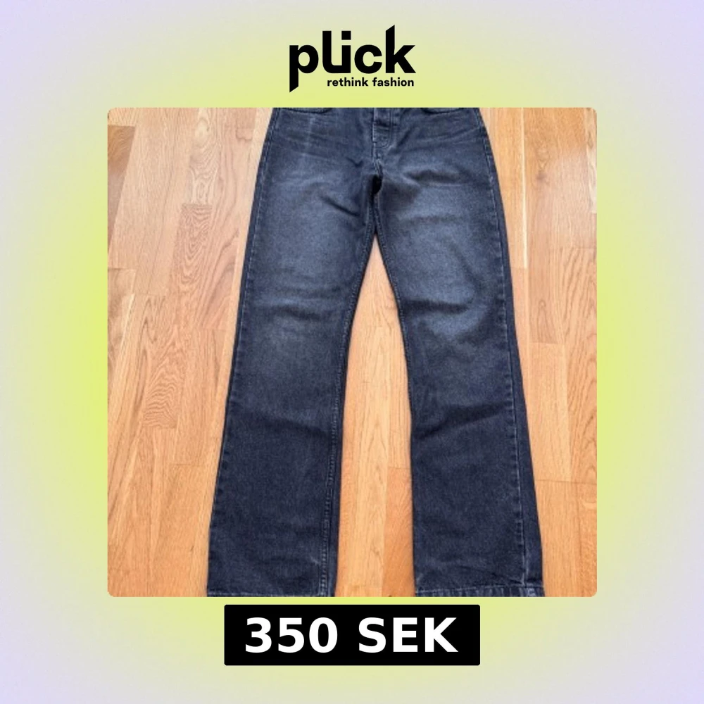 Snygga svarta jeans med rak passform och klassisk femficksdesign. Jeansen har en mörk tvätt och är tillverkade i ett robust denimtyg som ger en cool och avslappnad vibe. Perfekta till sneakers eller boots. Använda tillräckligt för att slutet på benen har slitits ut men annars har jag inte sett någon annan defekt och de är i väldigt bra skick. Pris går att diskutera vid snabb affär.