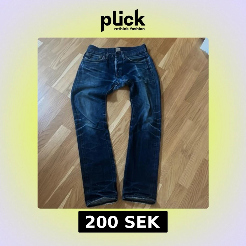 Säljer ett par Indigofera jeans i mörkblå tvätt med snygga slitningar och whiskers. Klassisk femficksmodell. På bild 4 ser du lite färg som har spillts på byxorna och i skrevet är det två små hål