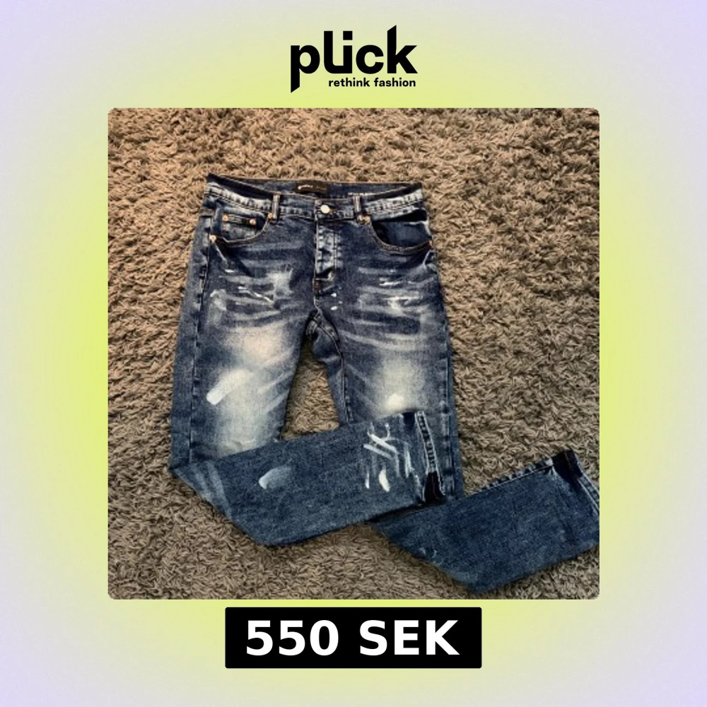 Säljer ett par blå jeans från Purple Brand med coolt distressed och blekt mönster. Jeansen har klassisk femficksdesign, orangea sömmar och snygga slitningar framtill och baktill. Perfekt för dig som gillar en edgy streetstil.