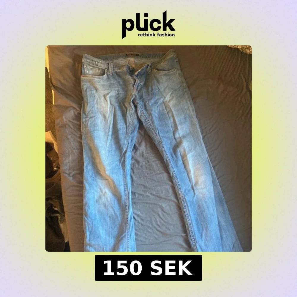 Säljer ett par klassiska blå jeans från Nudie Jeans. De har en normal passform och är tillverkade i en bomullsblandning med lite stretch för extra komfort. Perfekta för en avslappnad stil.
