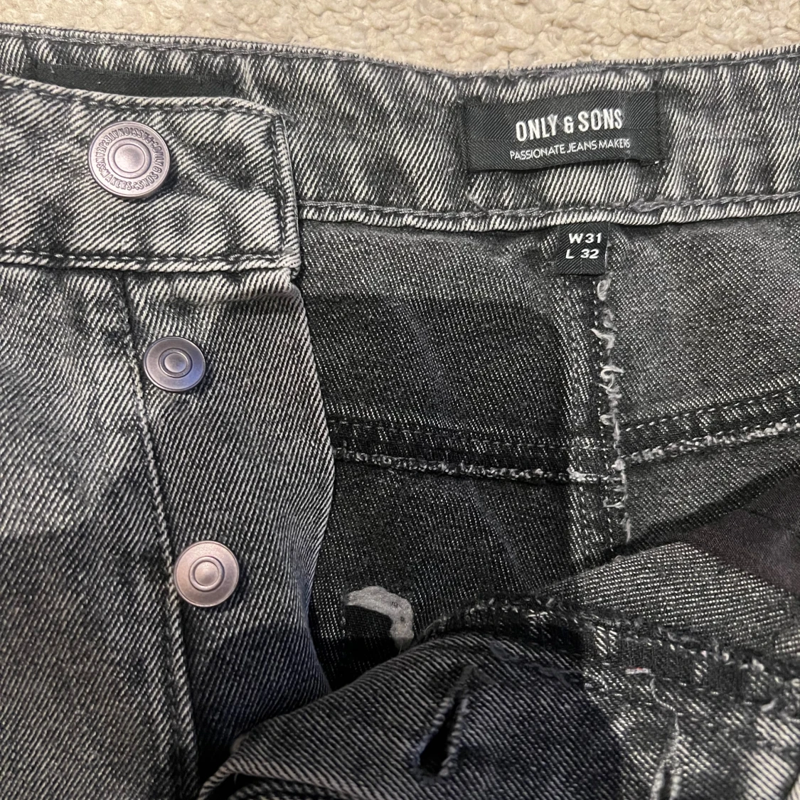 Snygga grå jeans från Only & Sons i klassisk femficksmodell. Jeansen har rak passform och normal midja, tillverkade i slitstarkt denim med knappar i metall. Perfekt för dig som gillar en chill och stilren look. Säljer för dem är för stora 🫶🏻