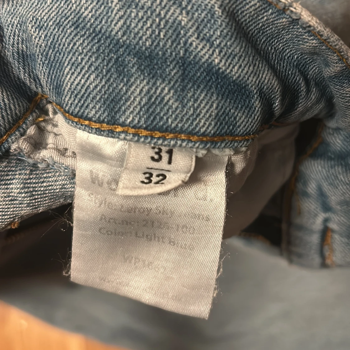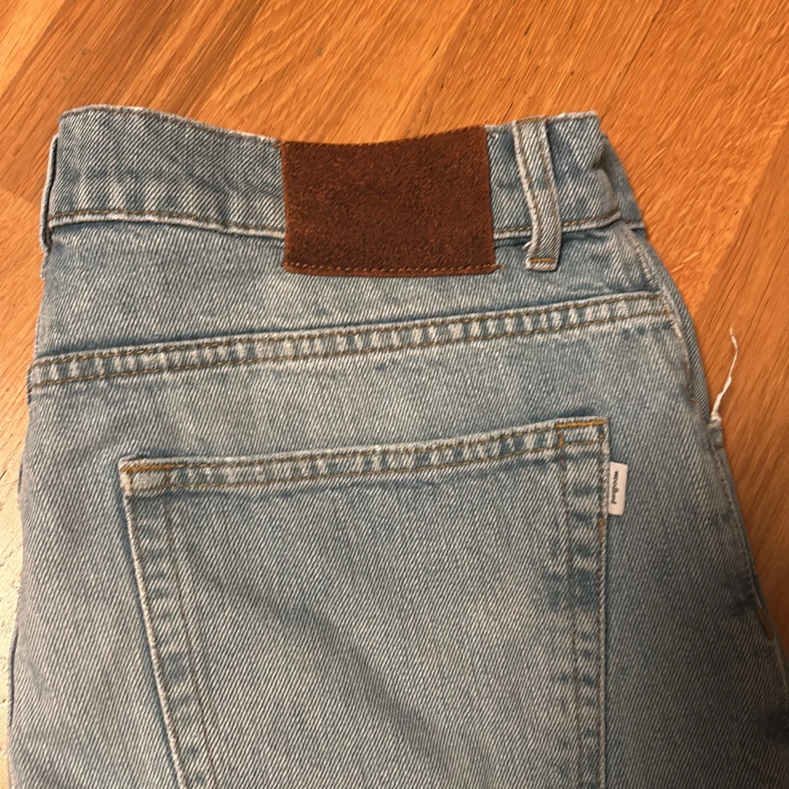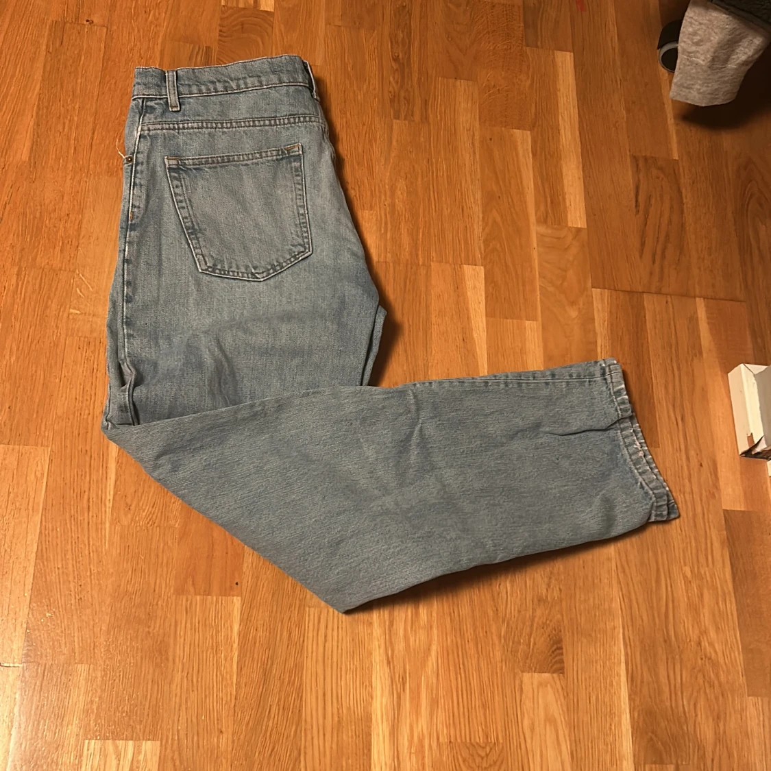 Säljer ett par klassiska blå jeansbyxor med rak passform. De har en midwaist design och är tillverkade i slitstarkt denim. Byxorna har en dragkedja och knapp framtill samt fem fickor. Perfekta för en avslappnad stil.