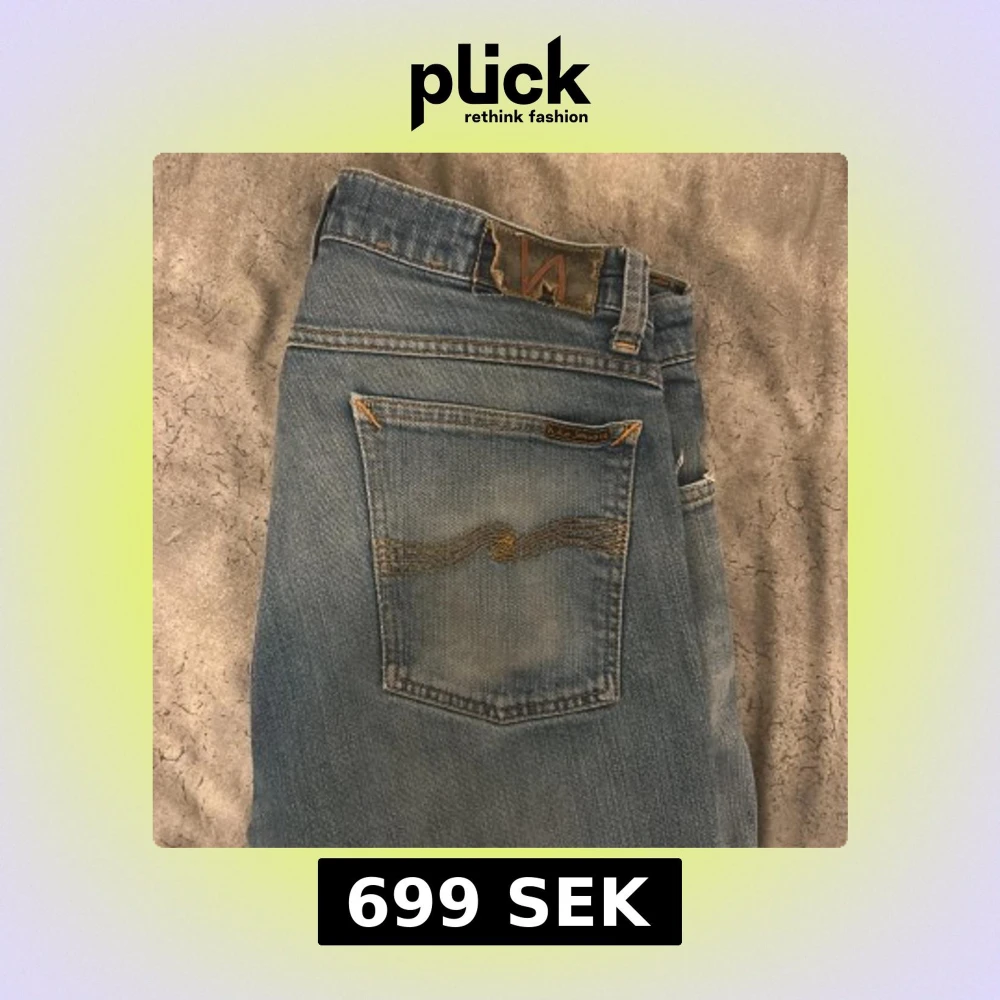 Säljer ett par ljusblå jeans från Nudie Jeans med klassisk femficksdesign och snygga slitningar. Jeansen har kontrastsömmar och Nudie-logga på bakfickan. Perfekt för dig som gillar en avslappnad och trendig look.