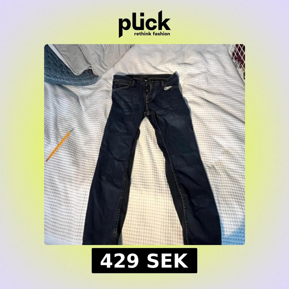 Säljer ett par mörkblå jeans från Nudie Jeans med klassiska bakfickor och kontrastsömmar. Jeansen har rak passform och är tillverkade i slitstarkt denimtyg. Nypris: 1599 kr Använda 1 gång!!
