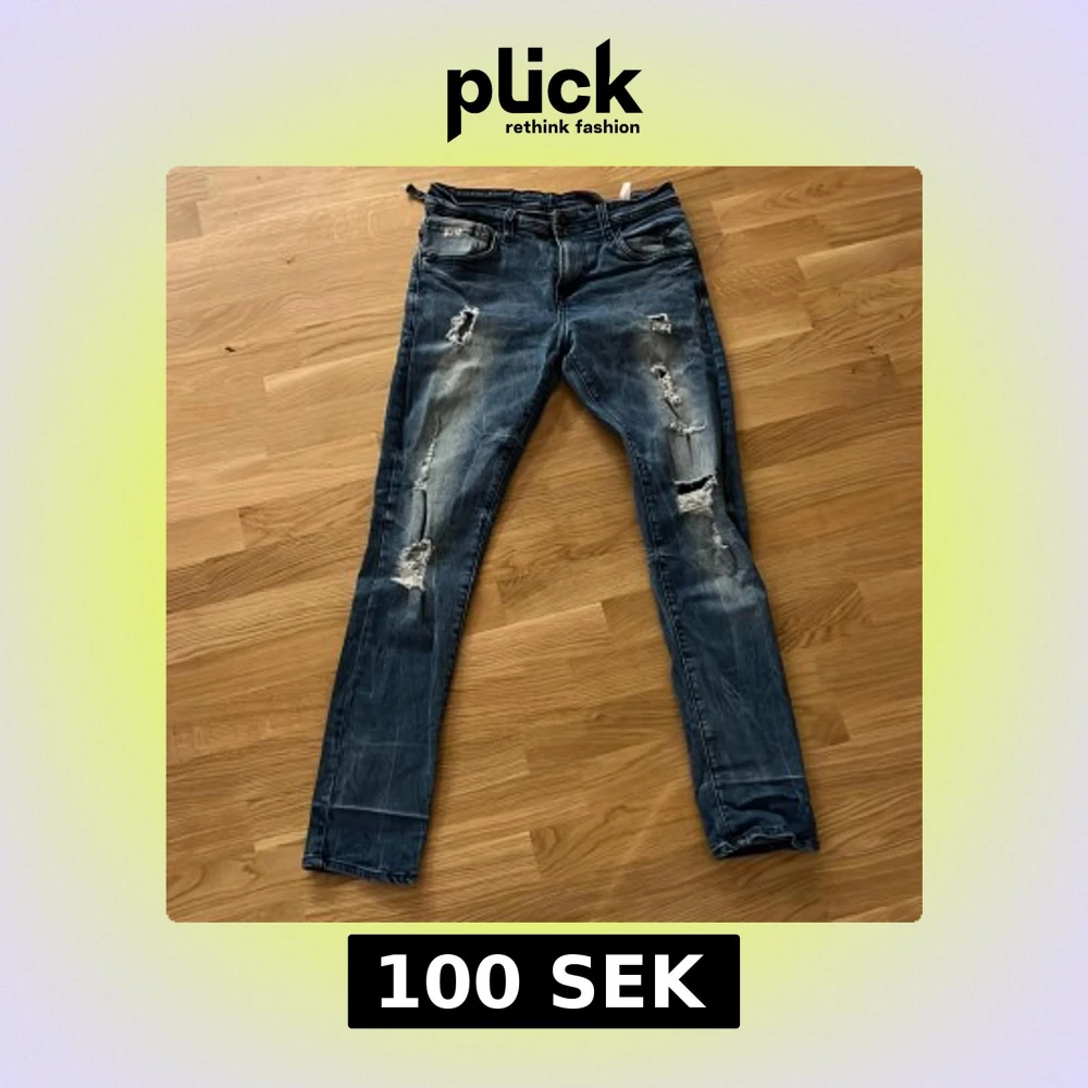 Säljer ett par blå jeans från Duracon med snygga slitningar och hål på framsidan. Jeansen har en smal passform och klassisk femficksdesign. De är tillverkade i jeansmaterial och har en cool, tvättad look med ljusare partier.