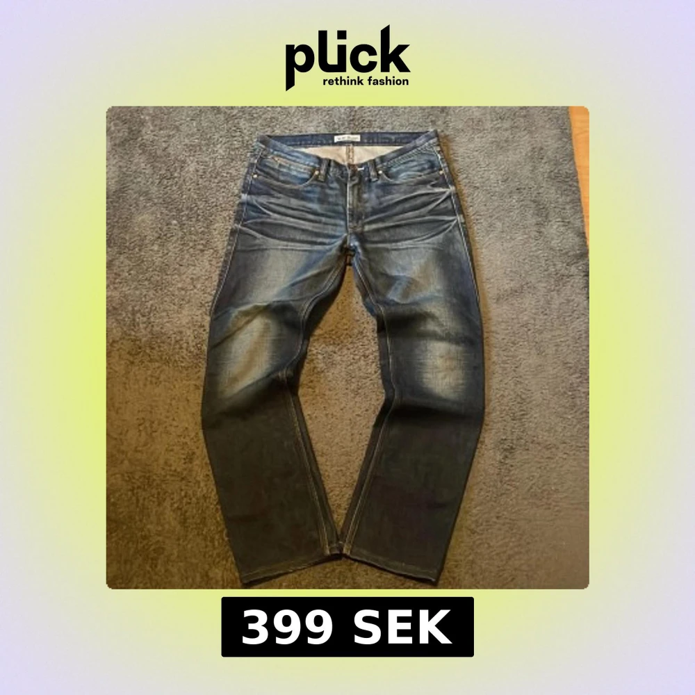 Snygga mörkblå jeans från Acne Jeans med klassisk femficksdesign och läderpatch bak i midjan. Jeansen har raka ben och subtila slitningar för en cool look. Tillverkade i robust denim som ger en autentisk känsla och passar riktigt bra nu till vintern/vårn. Hör av er vid funderingar och pris kan diskuteras vid snabb affär!
