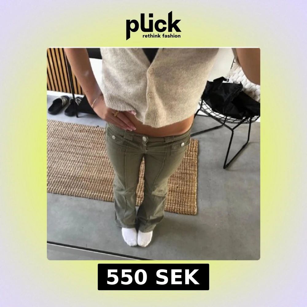 Snygga lågmidjade byxor i en olivgrön nyans med bootcut-ben, är slutsålda från hm. Byxorna har dekorativa fickor framtill, dubbla knappar och markerade .Jättefina till många outfits💗(andvänder bilder ifrån det förra jag köpte ifrån)
